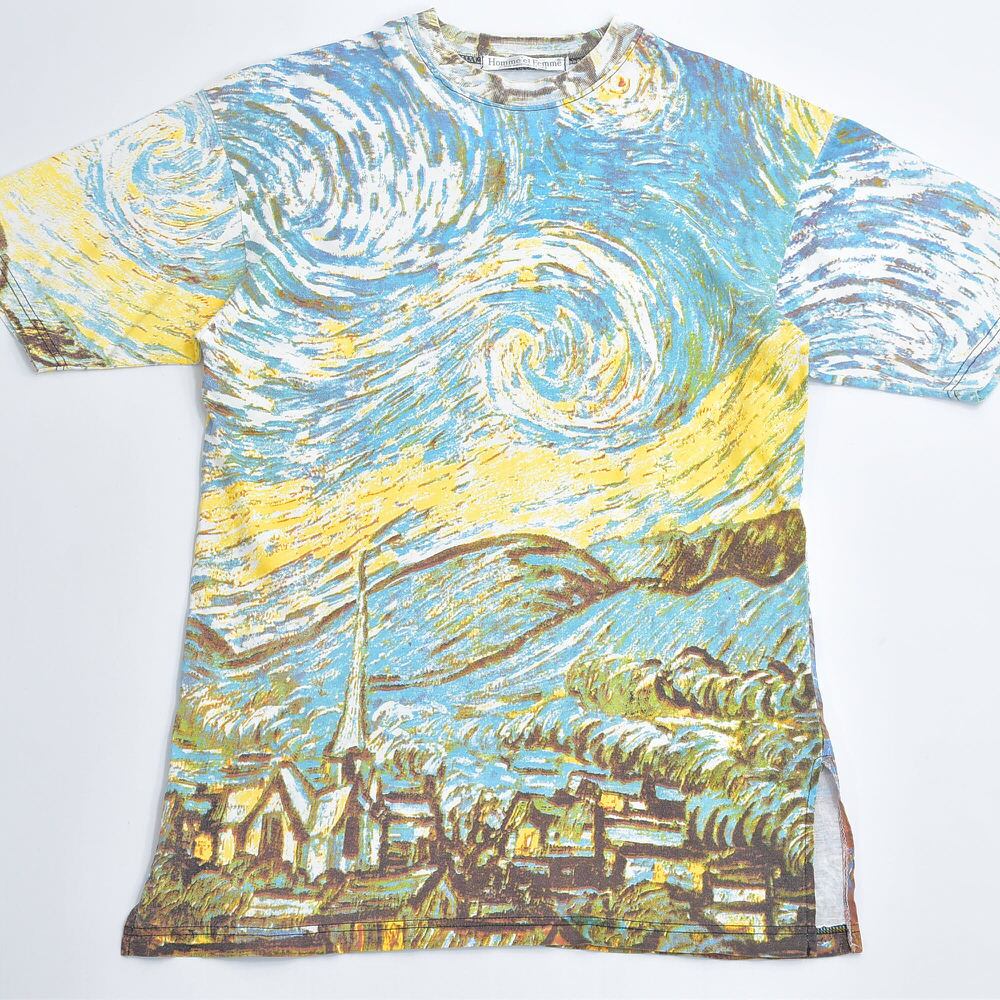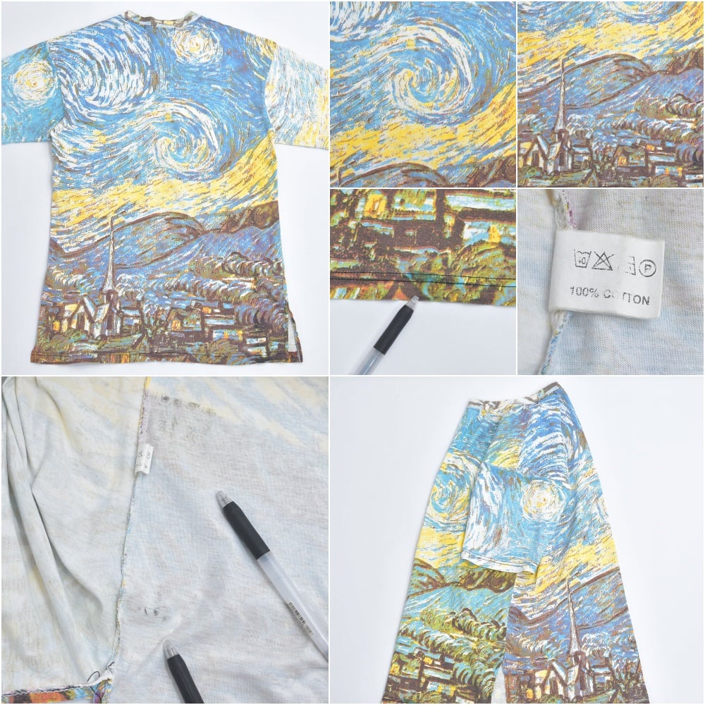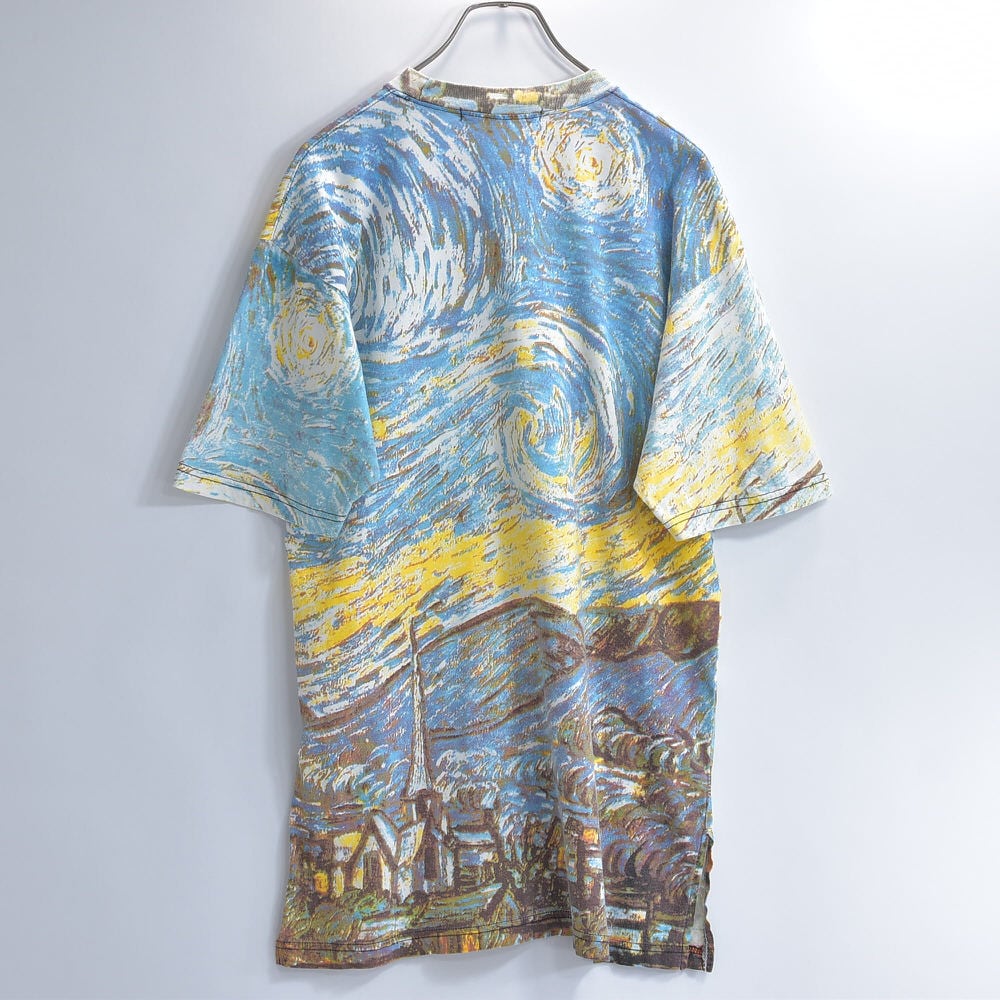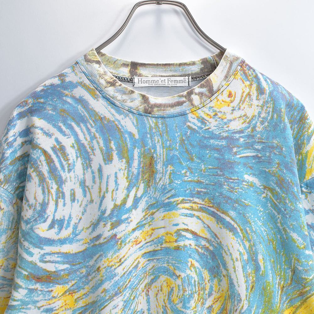 90s~ Homme et Femme ゴッホ 星月夜 総柄 アート 全面プリント Tシャツ 半袖 スリット入り 絵画 ムーブメント ヴィンテージ ブルー ビンテージ 古着 メンズ L相当