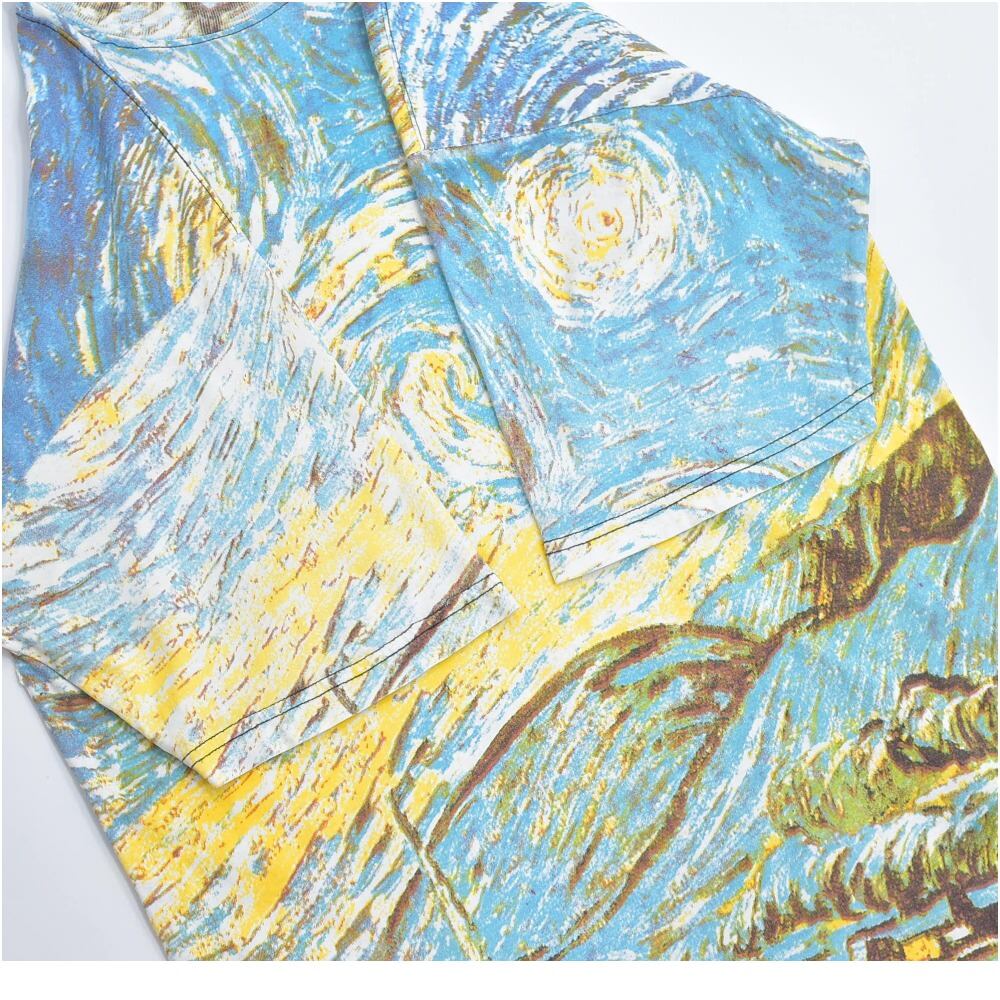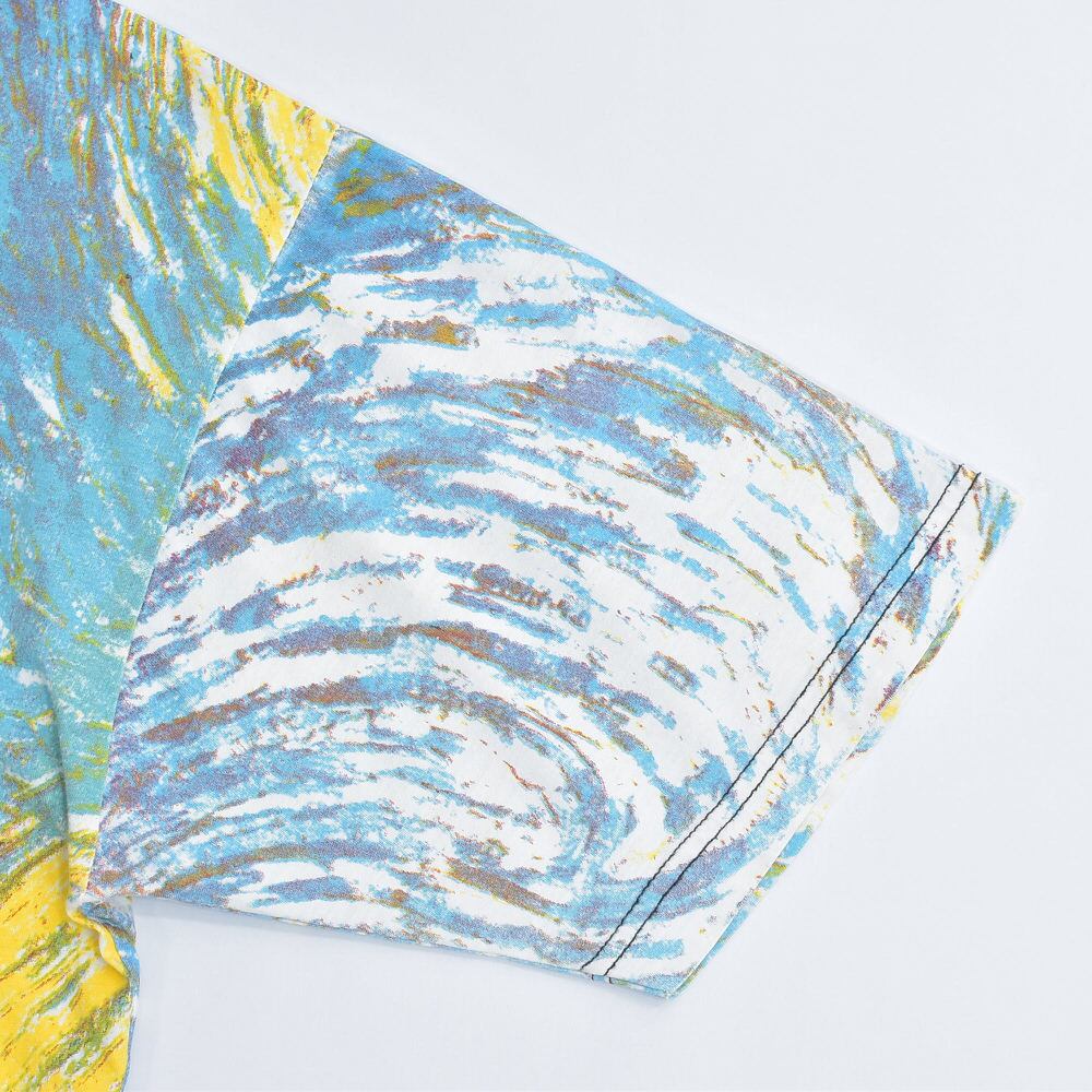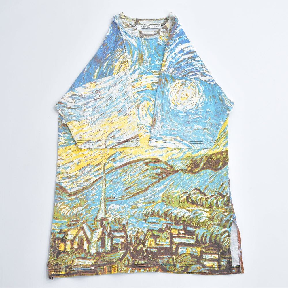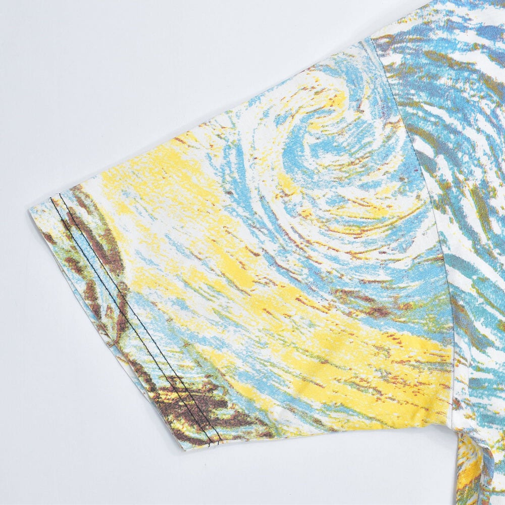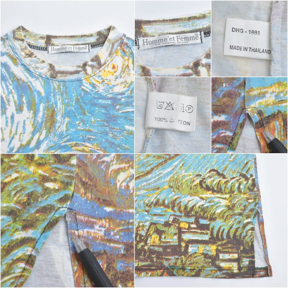 90s~ Homme et Femme ゴッホ 星月夜 総柄 アート 全面プリント Tシャツ 半袖 スリット入り 絵画 ムーブメント ヴィンテージ ブルー ビンテージ 古着 メンズ L相当
