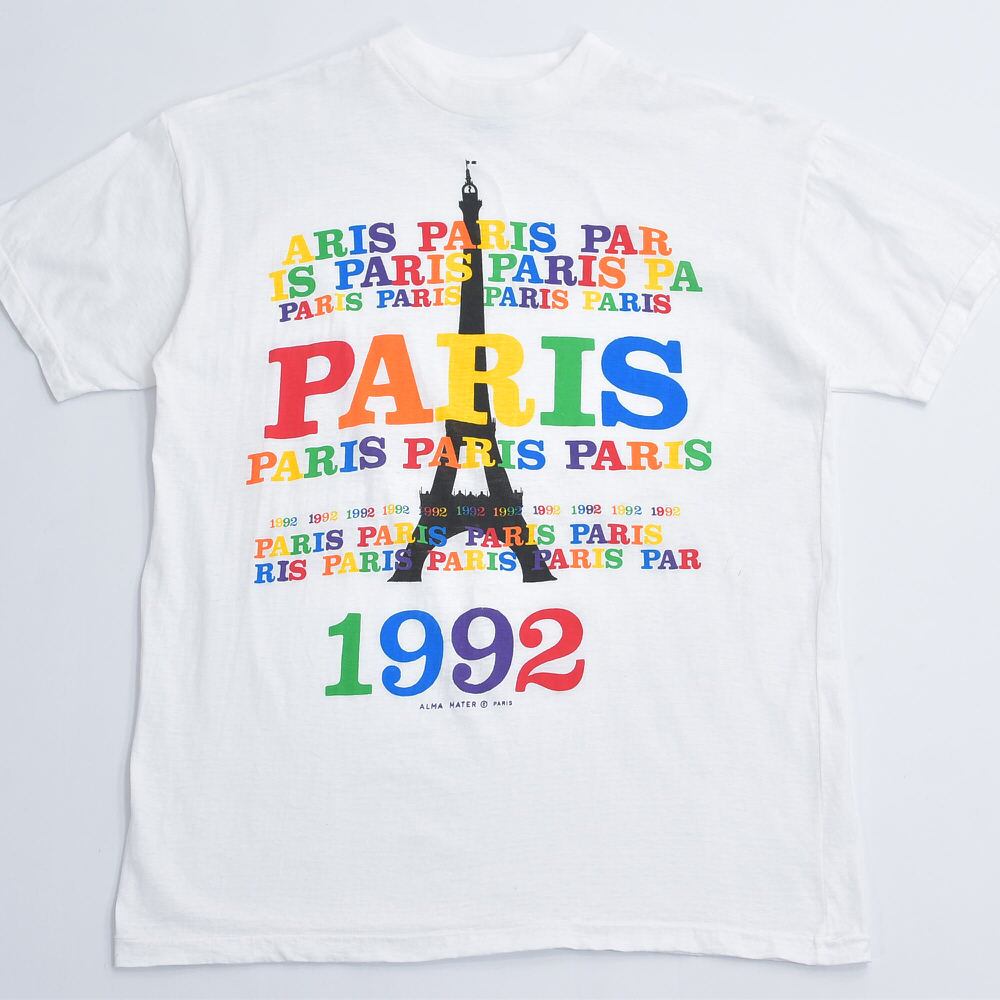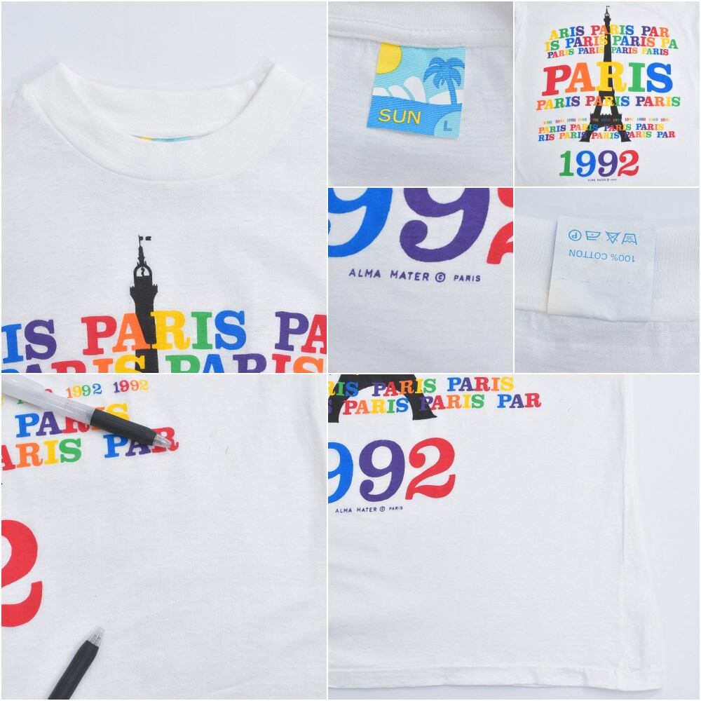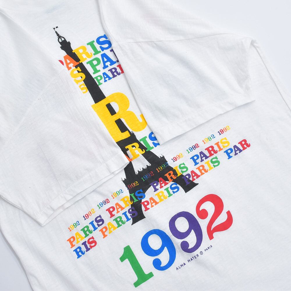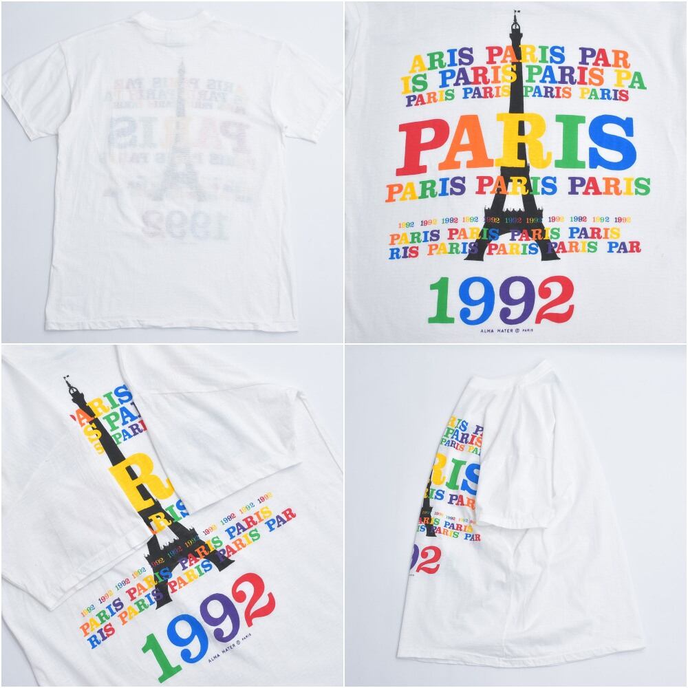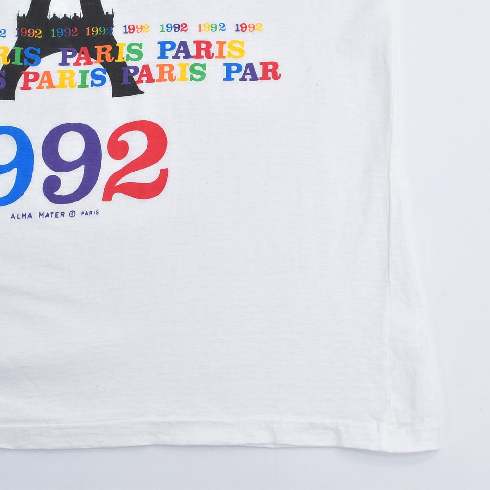 90s ALMA MATER アルママーテル エッフェル塔 PARIS1992 カラフルロゴ プリント グラフィック Tシャツ スーベニア お土産 ホワイト ヴィンテージ ビンテージ 古着 メンズ Lサイズ