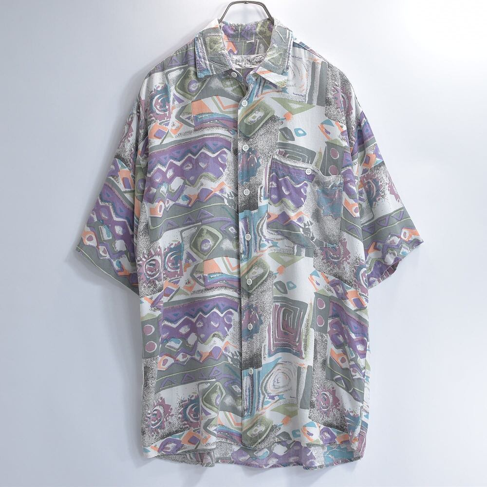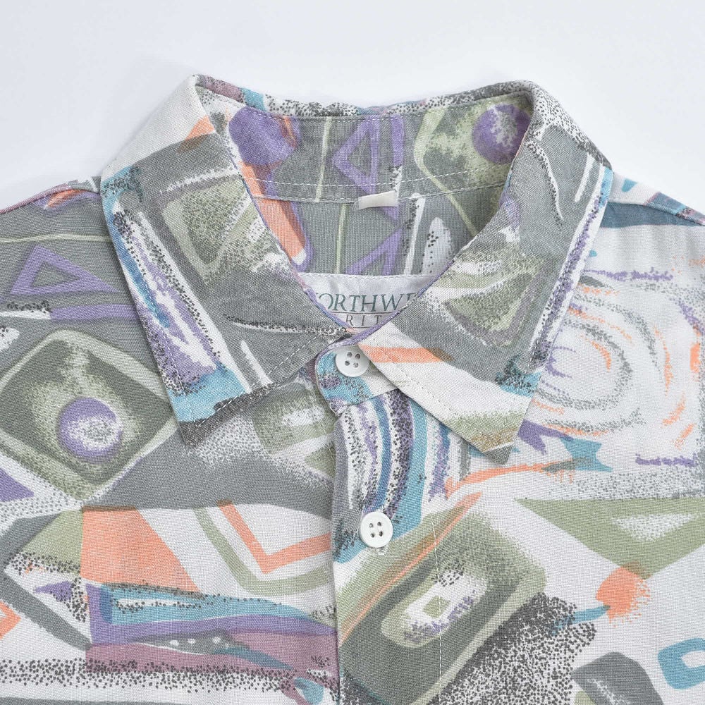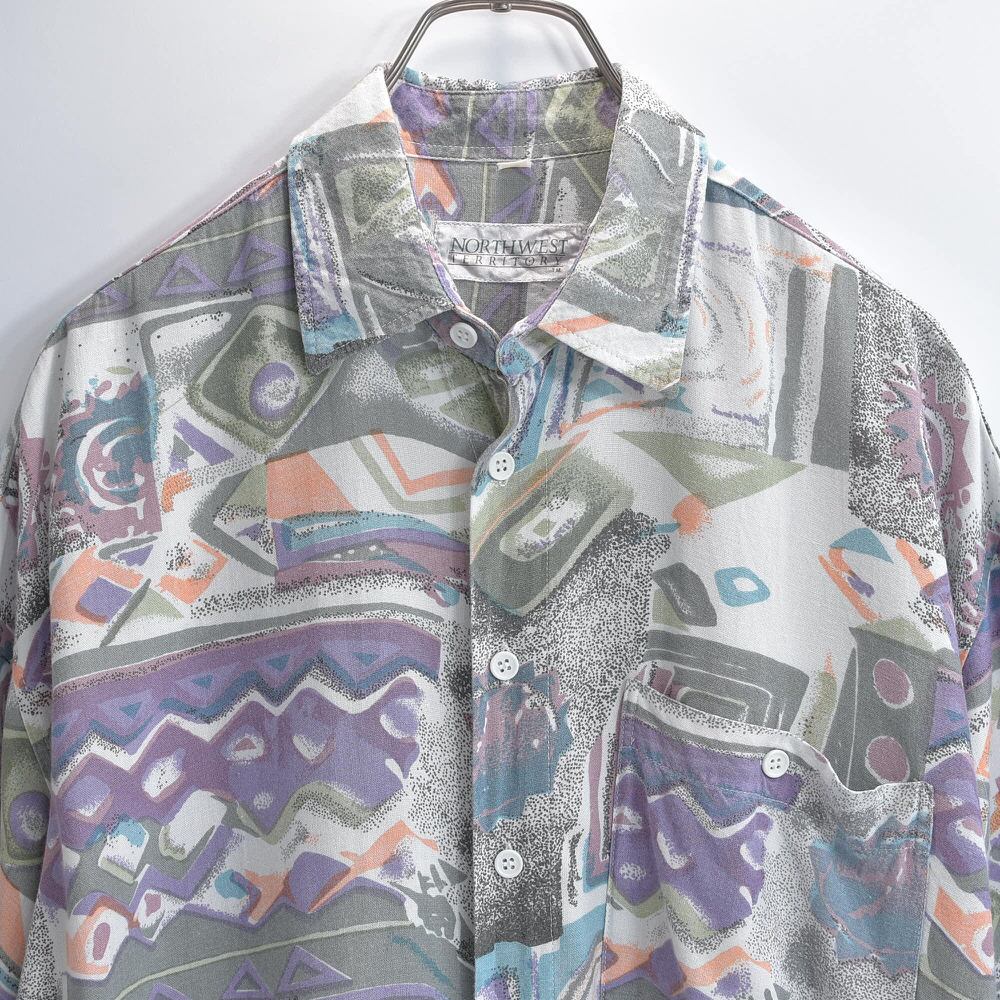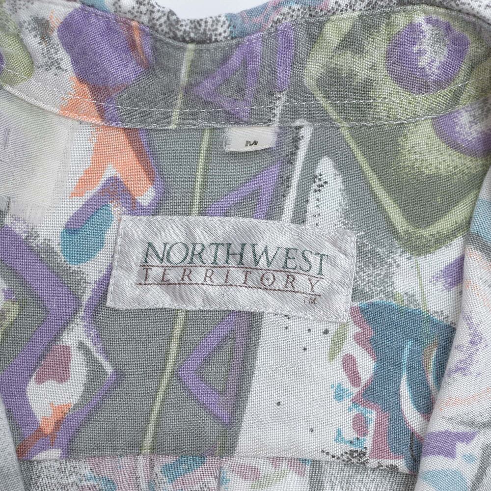 90s NORTHWEST TERRITORY 幾何学柄 総柄 半袖 シャツ アート アブストラクト デザインシャツ マルチカラー ヴィンテージ ビンテージ USA アメリカ古着 メンズLサイズ