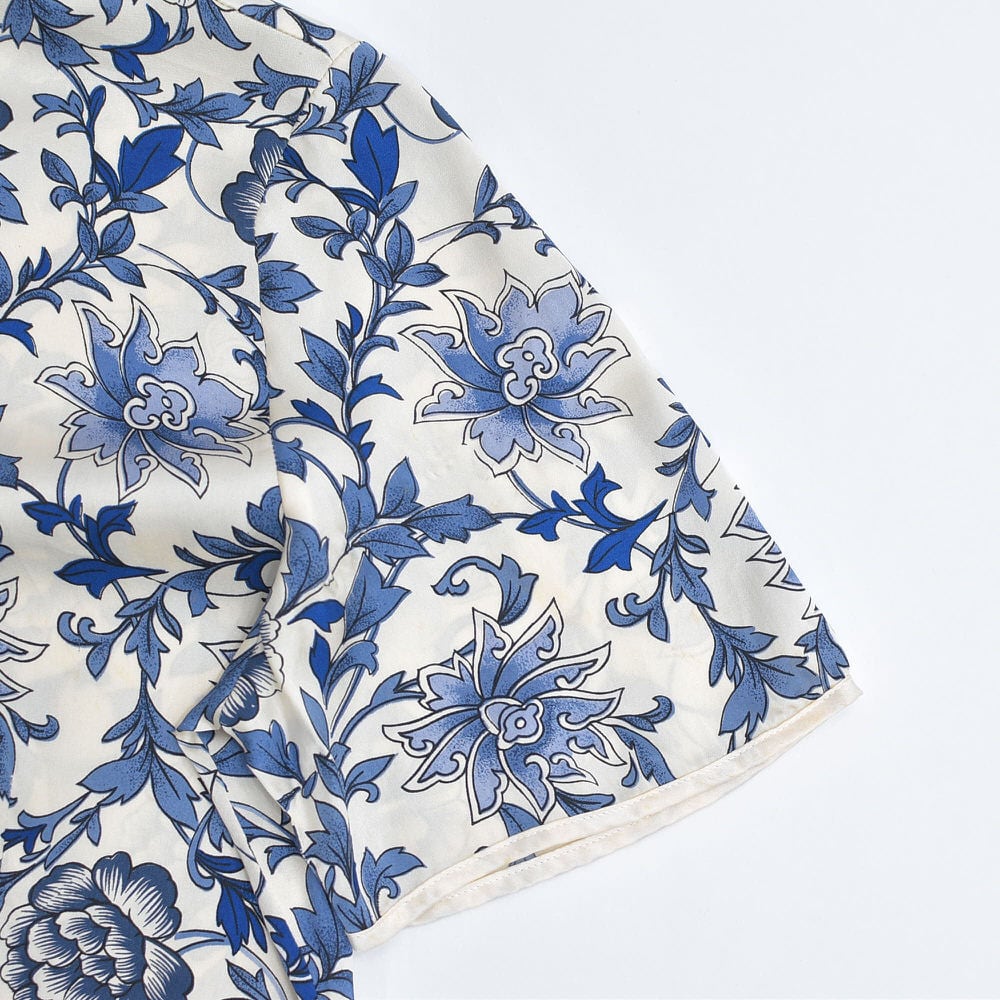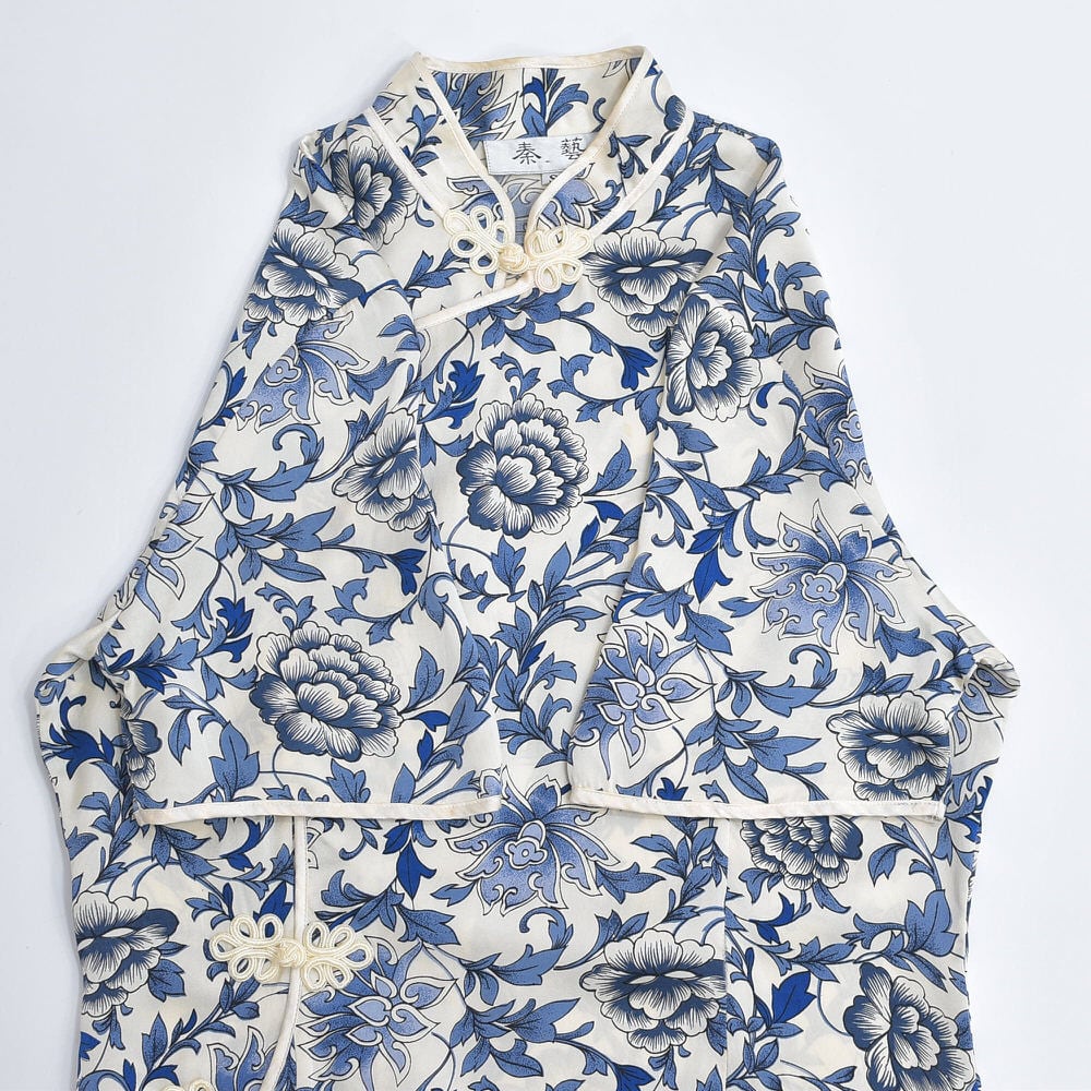 90-0s 中国製 秦藝 Qin Yi チャイナドレス ワンピース 旗袍 シルク100% 花柄 青花磁器 クリームホワイト ブルー ヴィンテージ ビンテージ 古着 レディースSサイズ