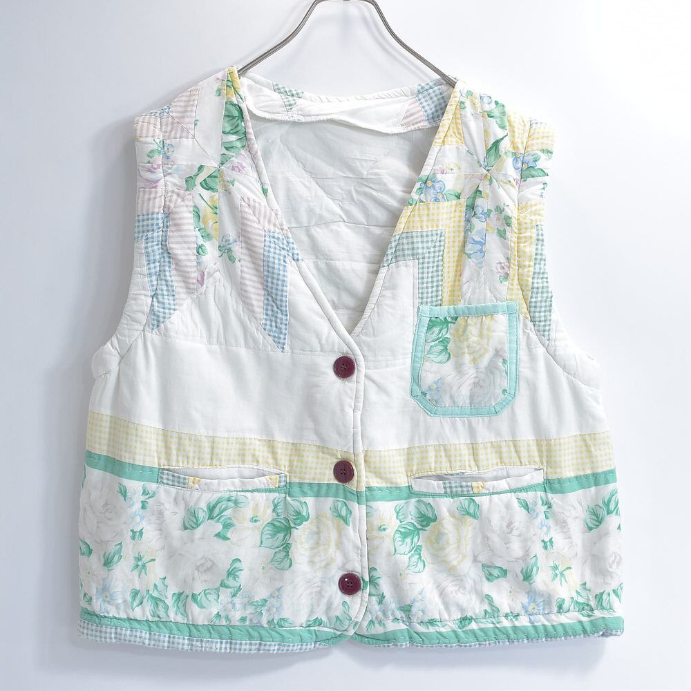 Remake ハンドメイド デザイン リメイク パッチワーク キルト ベスト アウター 再構築 ツギハギ 中綿入り ホワイト 花柄 レディースXL相当