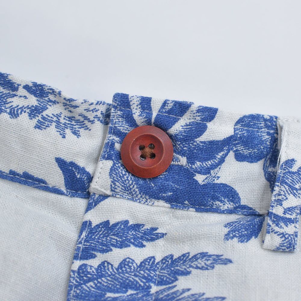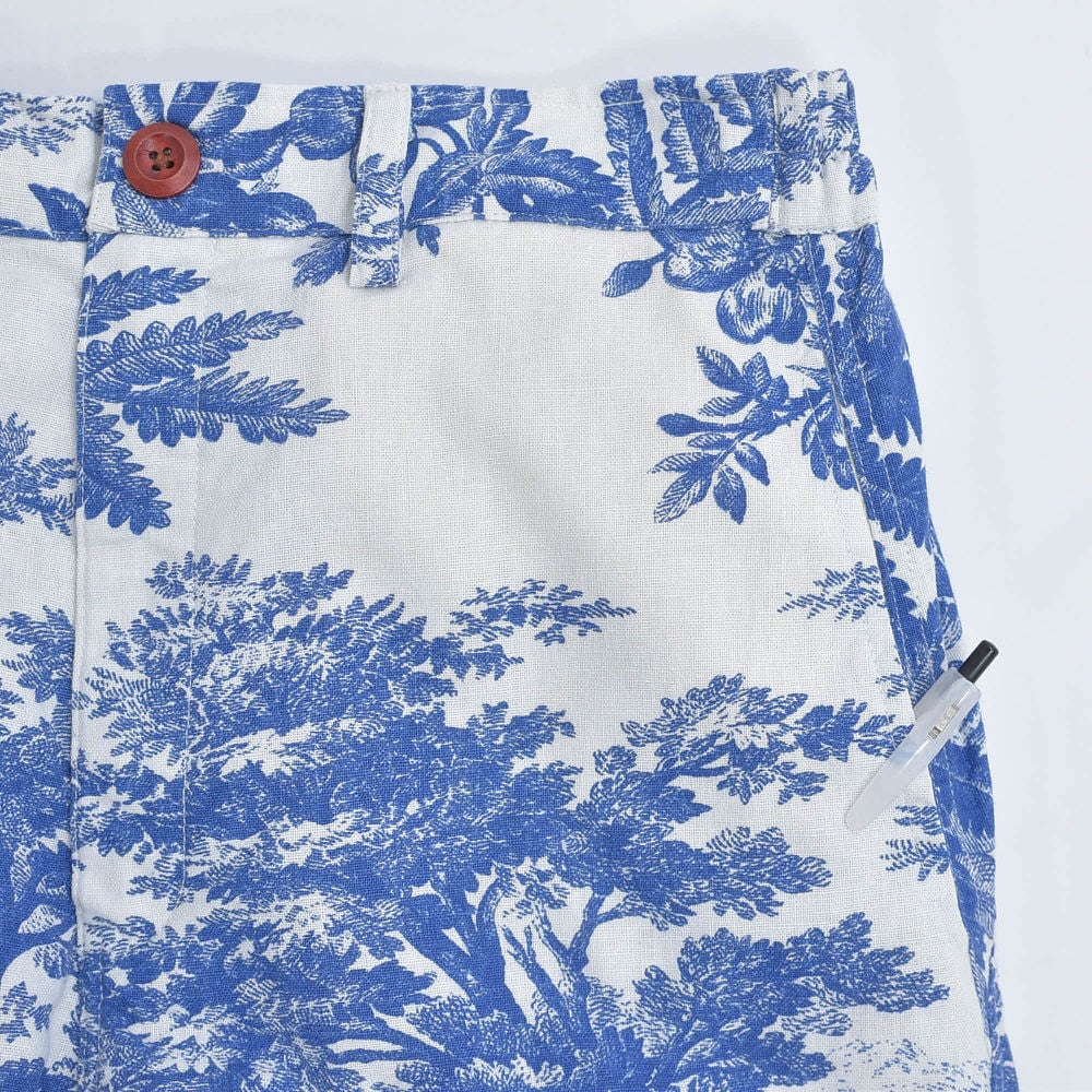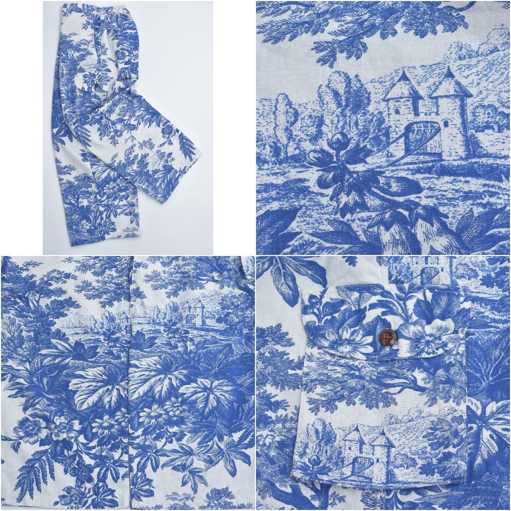 フランスの伝統柄、トワル・ド・ジュイのパターンクロスをボトムスに再構築したリメイクパンツ