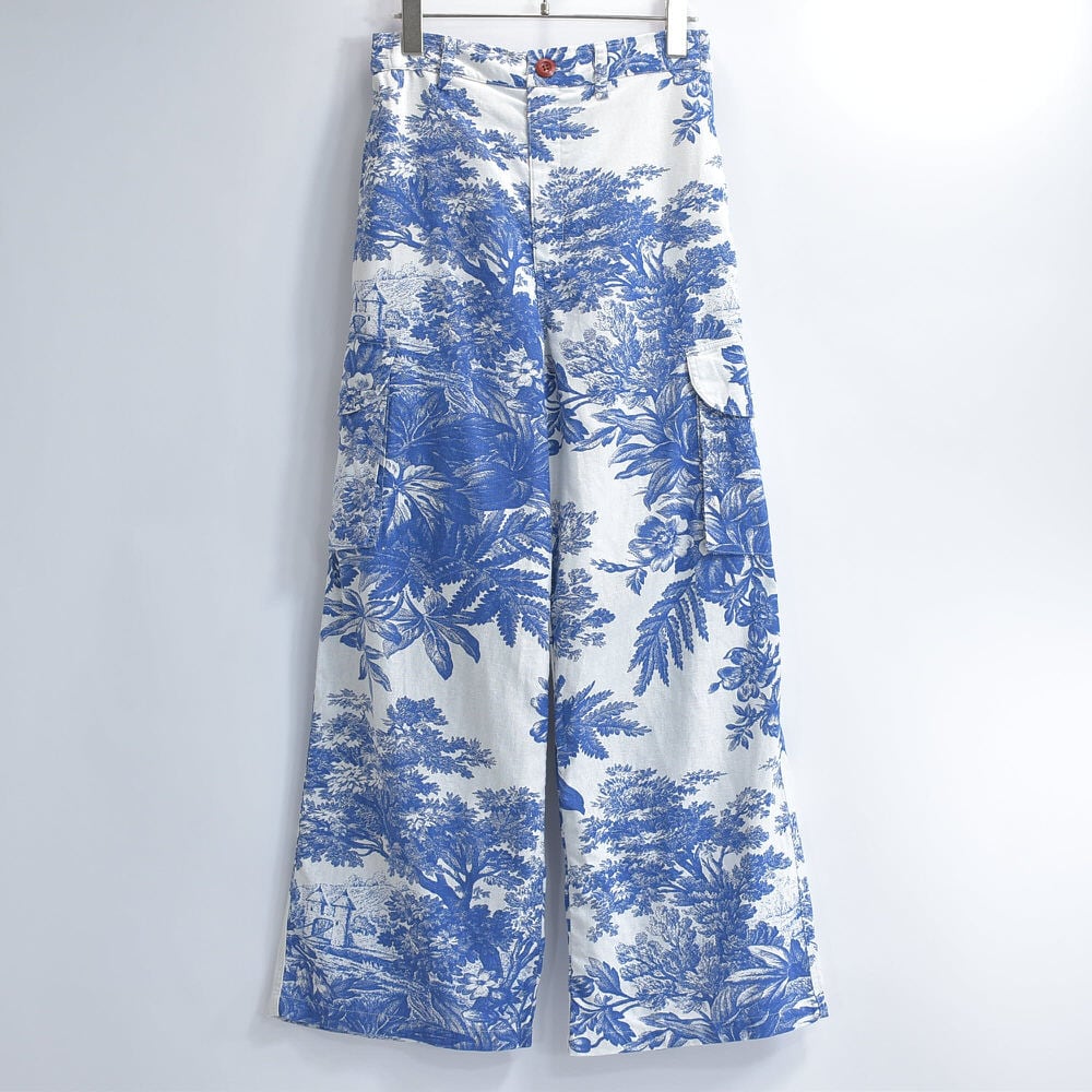 Remake ヴィンテージ アンティーク調 トワル・ド・ジュイ柄 テキスタイル 再構築 リメイク 総柄 ワイド カーゴ パンツ オフホワイト 裏地付き 古着 W68〜96cm