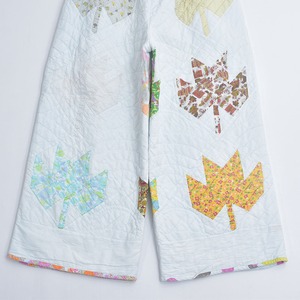 可愛らしいお花が描かれたキルト生地をボトムスに再構築したリメイクパンツ