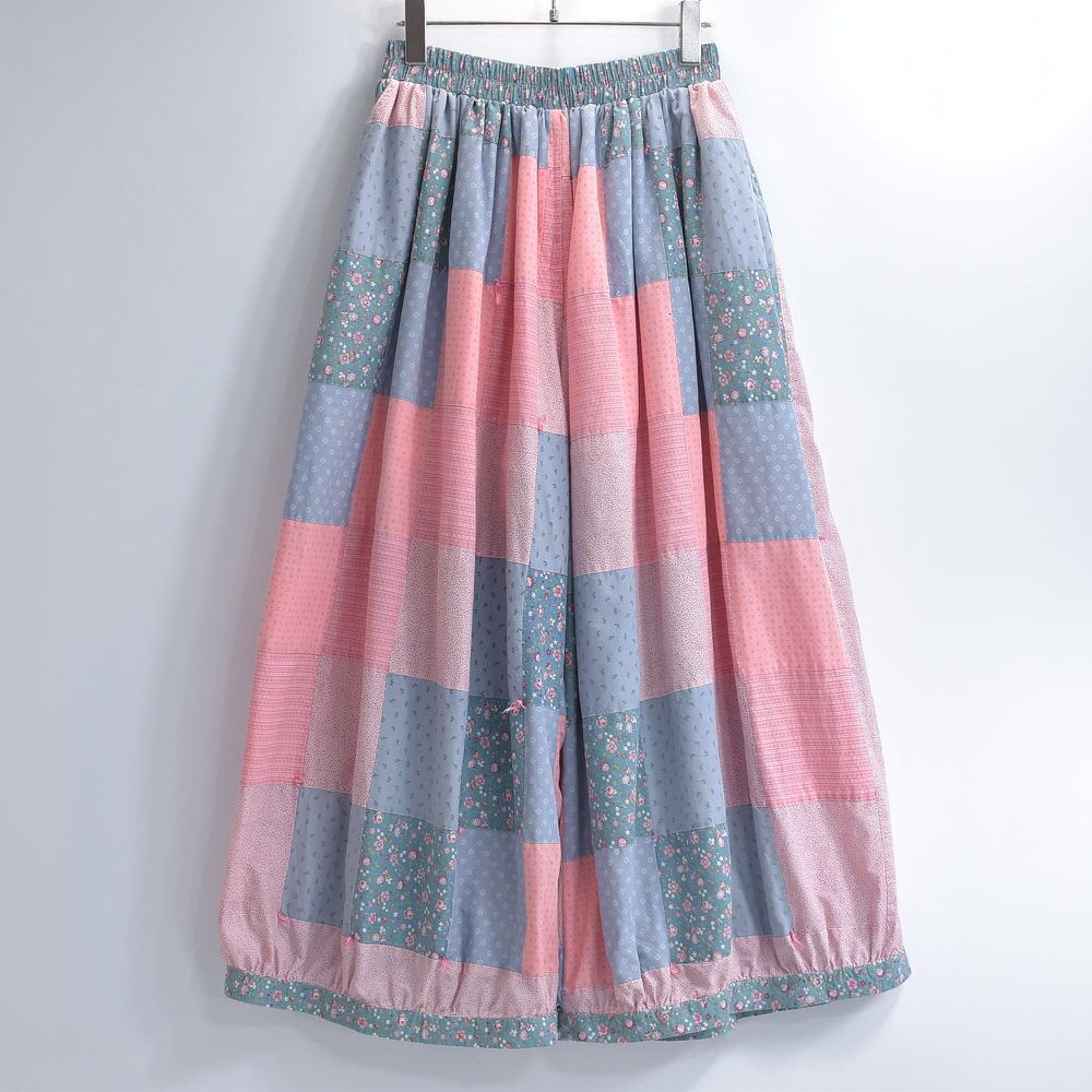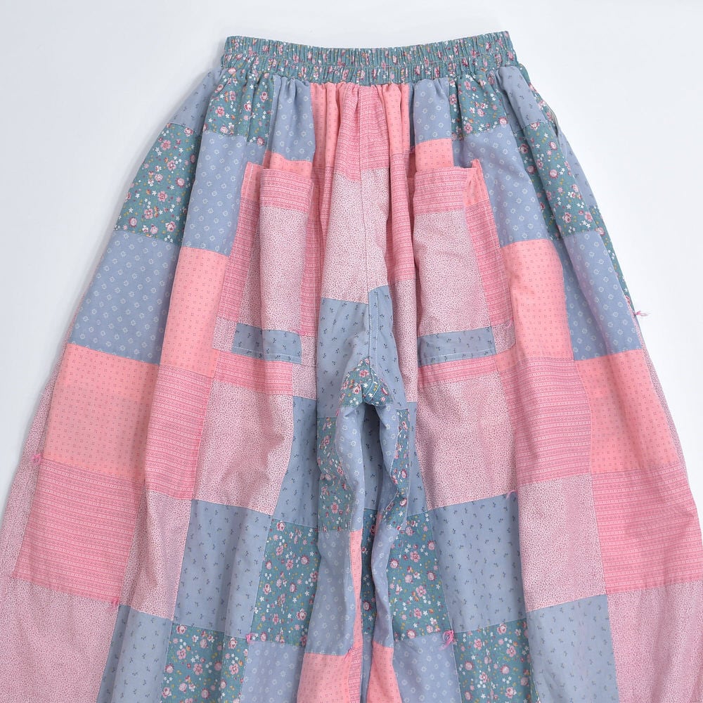 様々な色や柄の生地を繋ぎ合わせ、ボトムスに再構築したパッチワークのリメイクパンツ