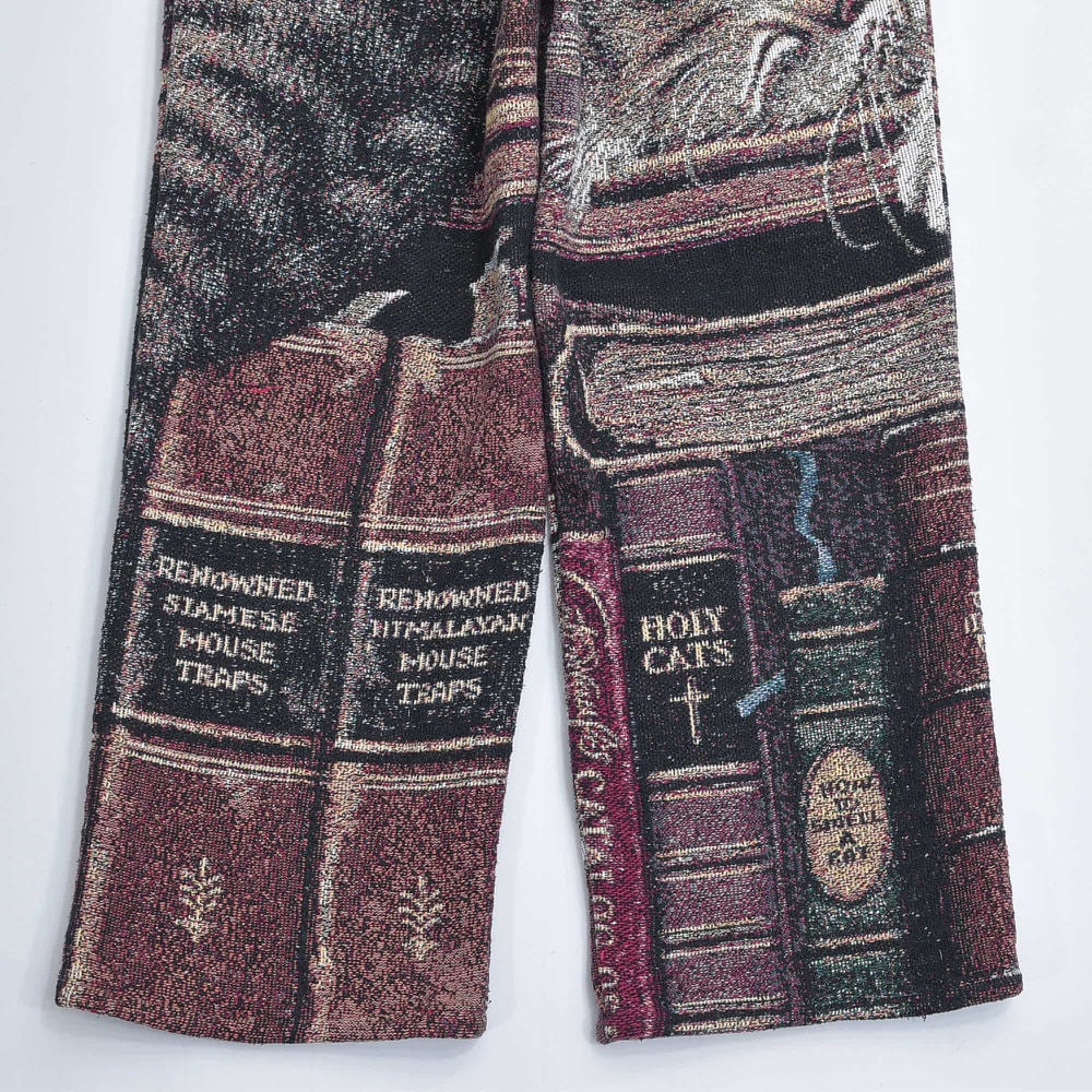 Remake リメイク ルーズシルエット ジャガード フクロウ ネコ デザイン ラグパンツ ブランケット パッチワーク イージーパンツ 再構築 コットン ブラック W66~105cm