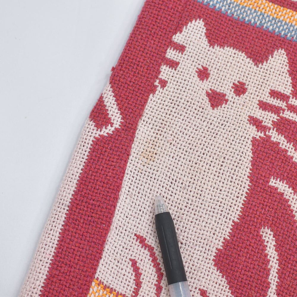 そこには、落ち着いたトーンのダークレッドをベースにお家やお花、アヒルさんが描かれたコミカルな風景柄のデザイン