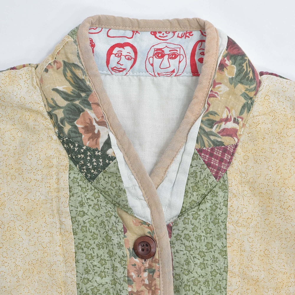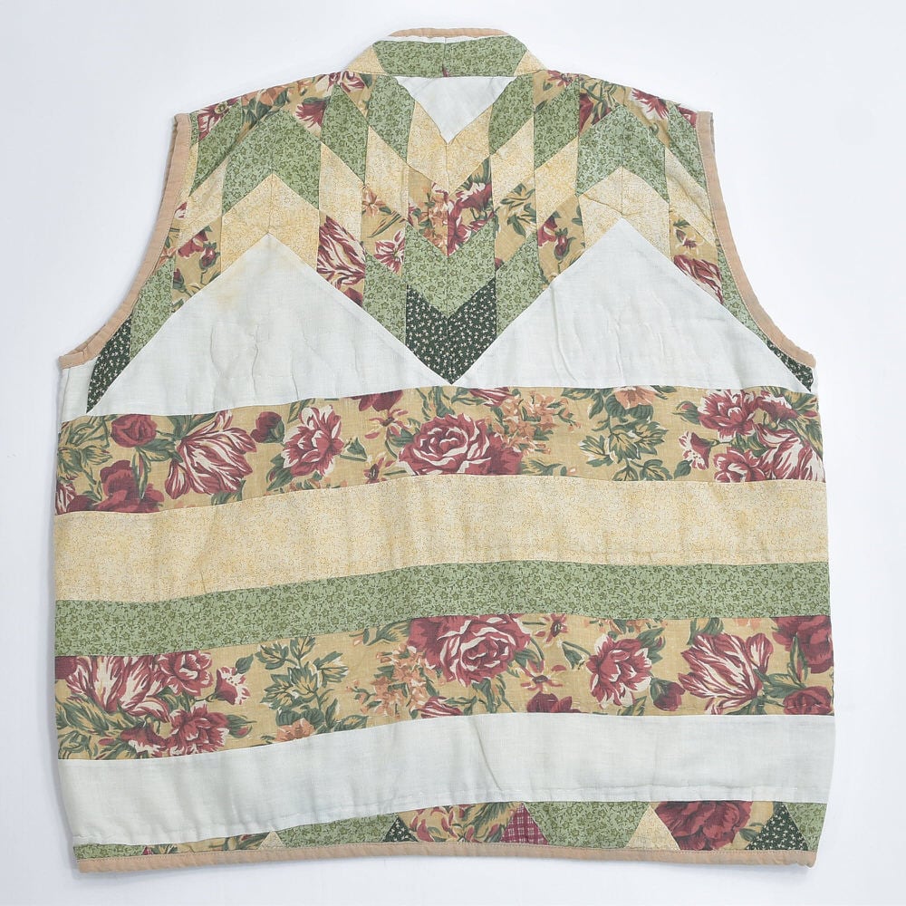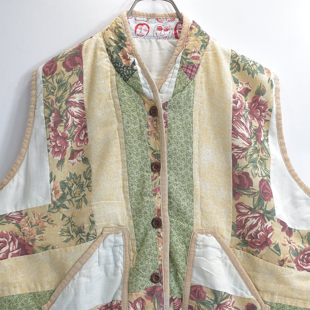 Remake ハンドメイド デザイン リメイク パッチワーク キルト ベスト アウター 再構築 ツギハギ 中綿入り ベージュ 花柄 レディースXL相当