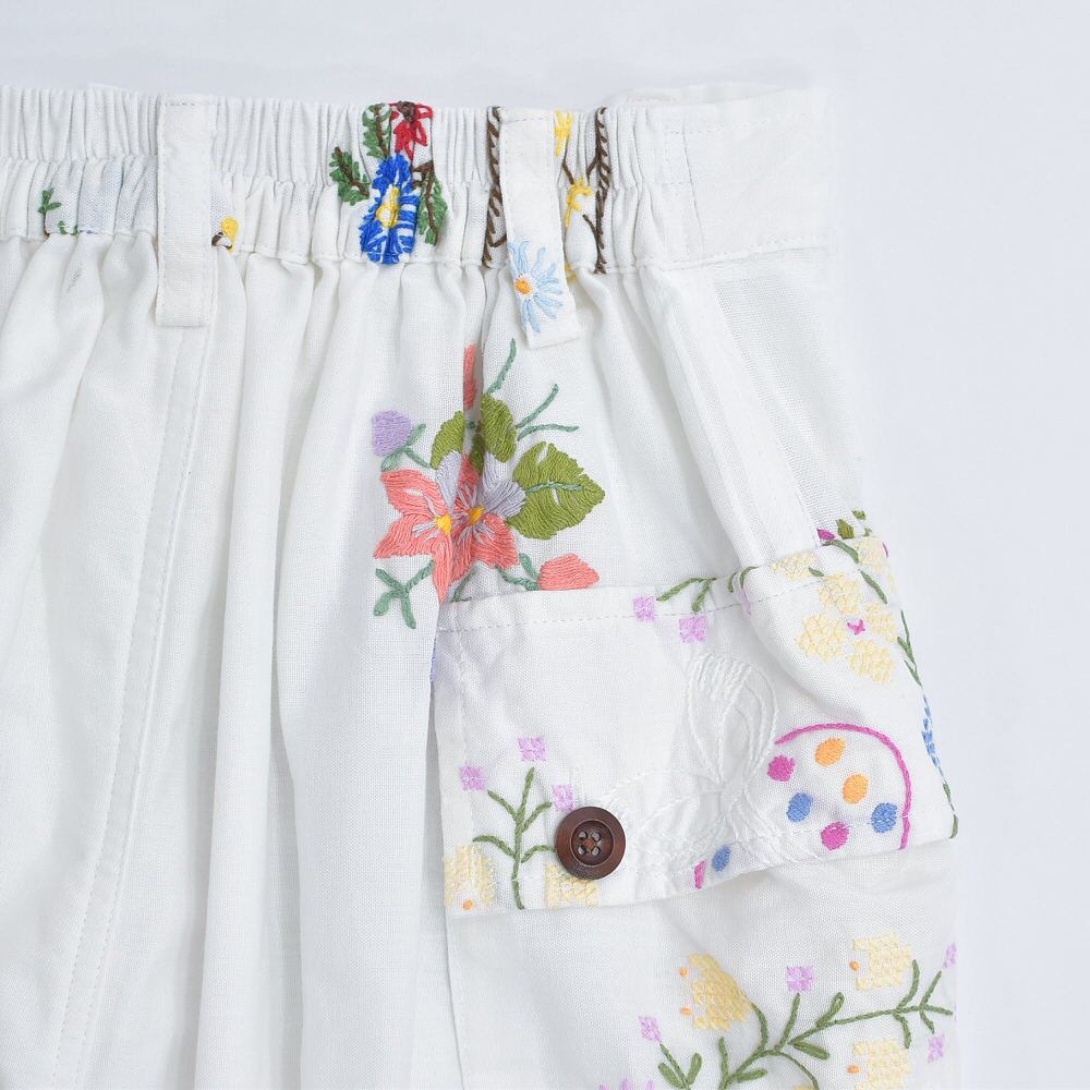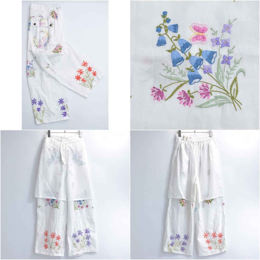 可愛らしく、でも上品な雰囲気も感じる花の刺繍が描かれたクロス生地をボトムスに再構築したリメイクパンツ