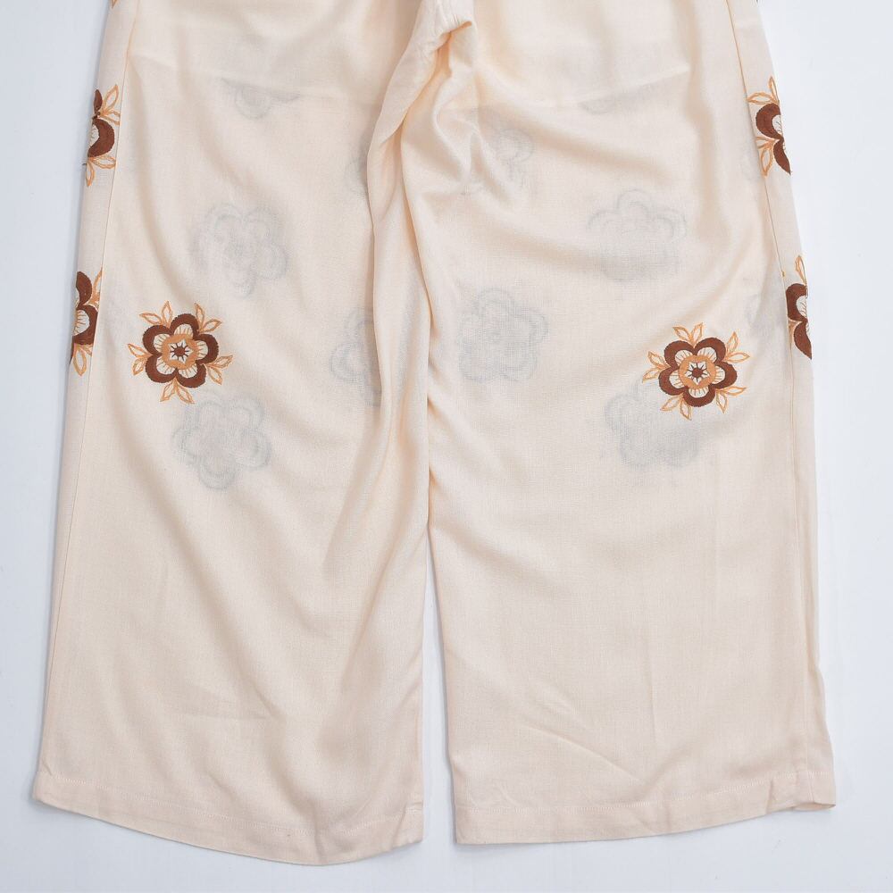 レトロでノスタルジー雰囲気に加えて、上品な趣きすら感じるお花の刺繍が描かれたクロス生地を、ボトムスに再構築したリメイクパンツ