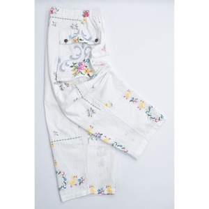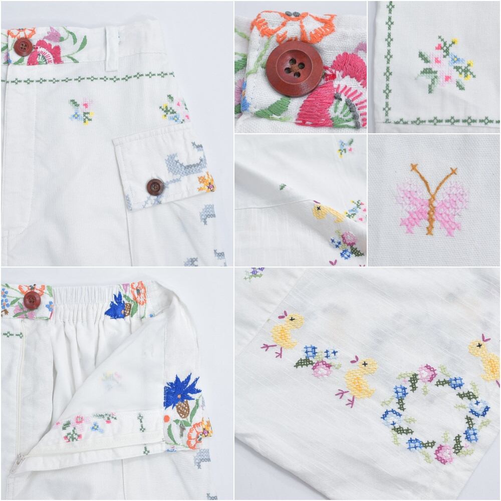 可愛らしい雰囲気のお花やアヒルさんのクロスステッチ刺繍が描かれた生地をボトムスに再構築したリメイクパンツ