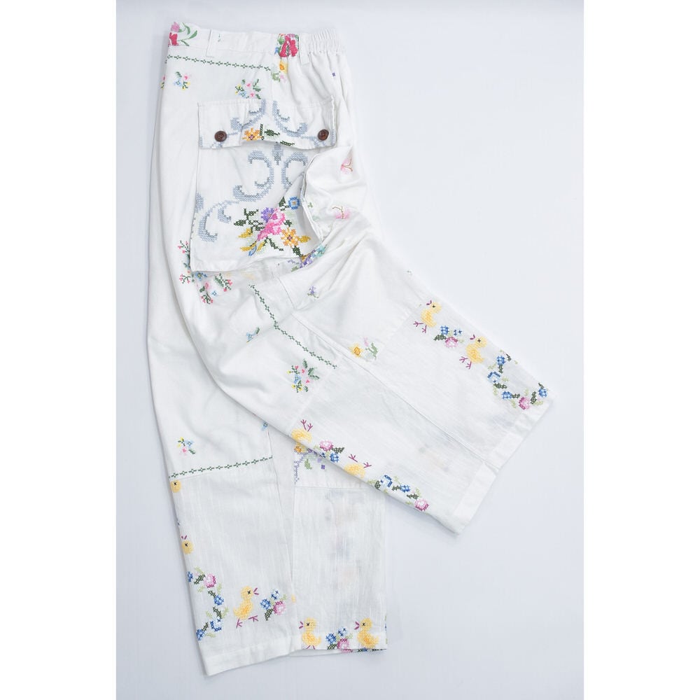 Remakeリメイク 再構築 パッチワーク&フラワー刺繍 デザイン ワイドシルエット コットン カーゴパンツ ホワイト バギー 古着 裏地付き W66〜96cm