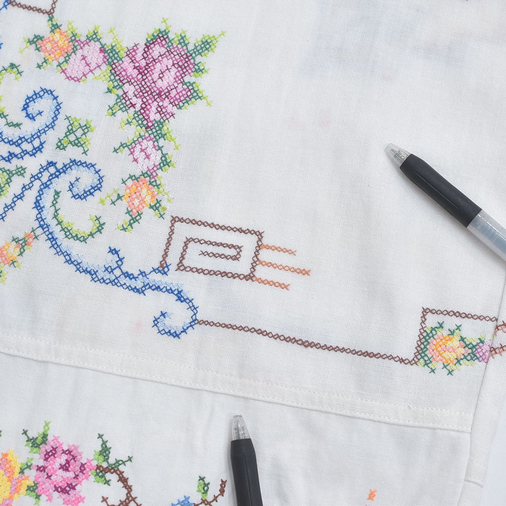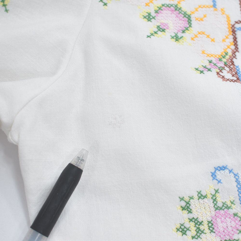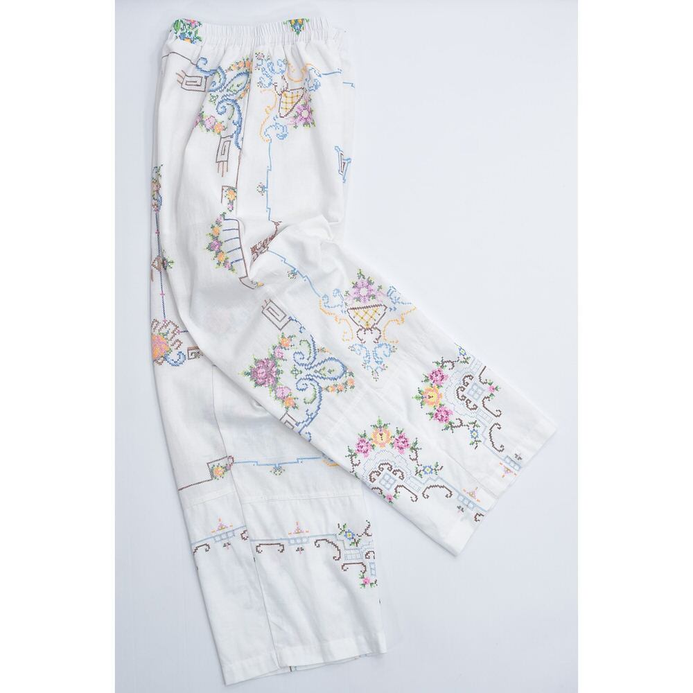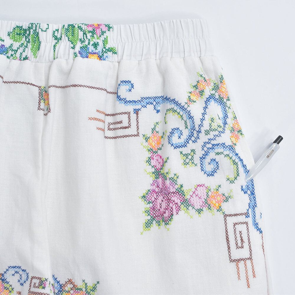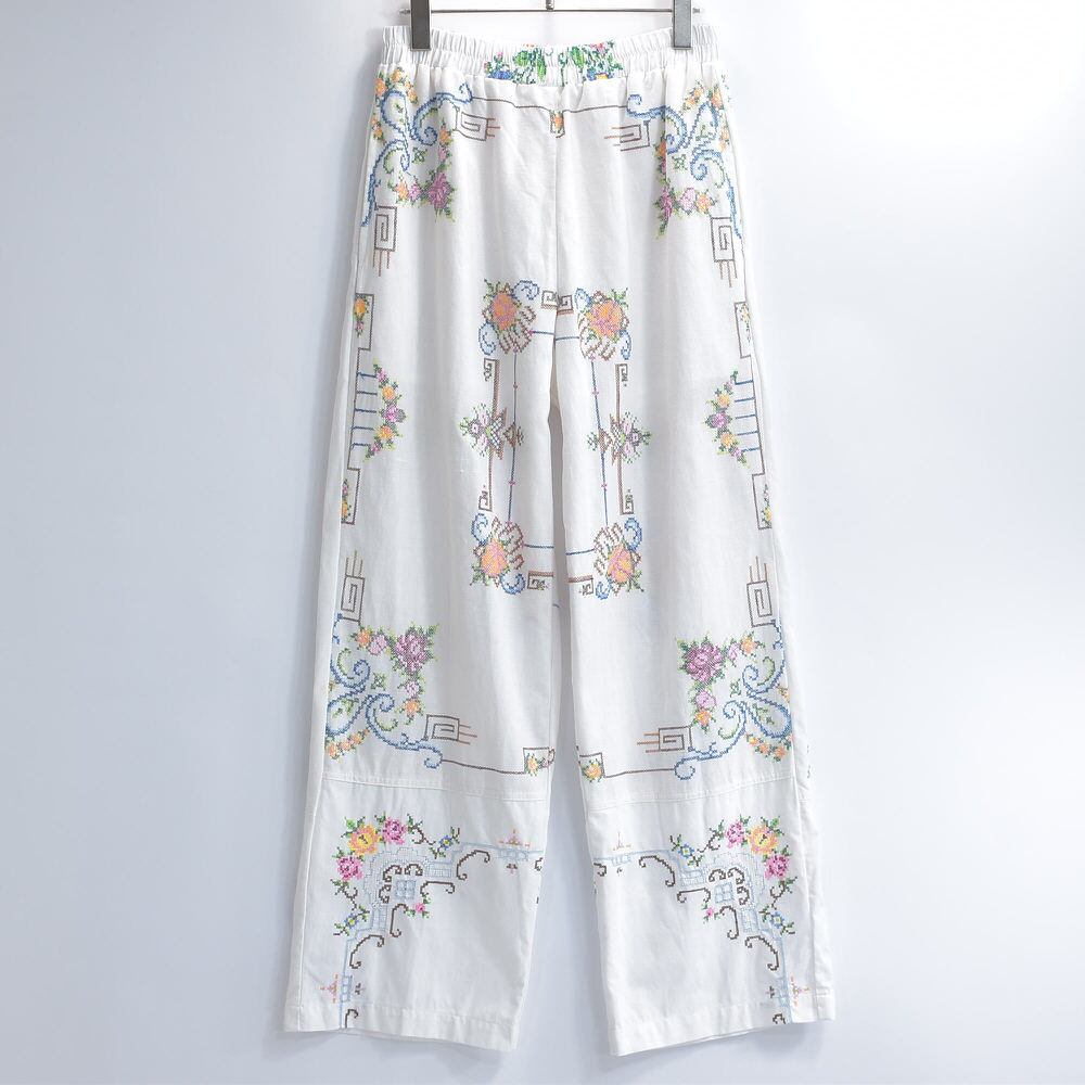 ノスタルジックな趣を感じる可愛らしいお花がクロスステッチで描かれたクロス生地をボトムスに再構築したパッチワークのリメイクパンツ