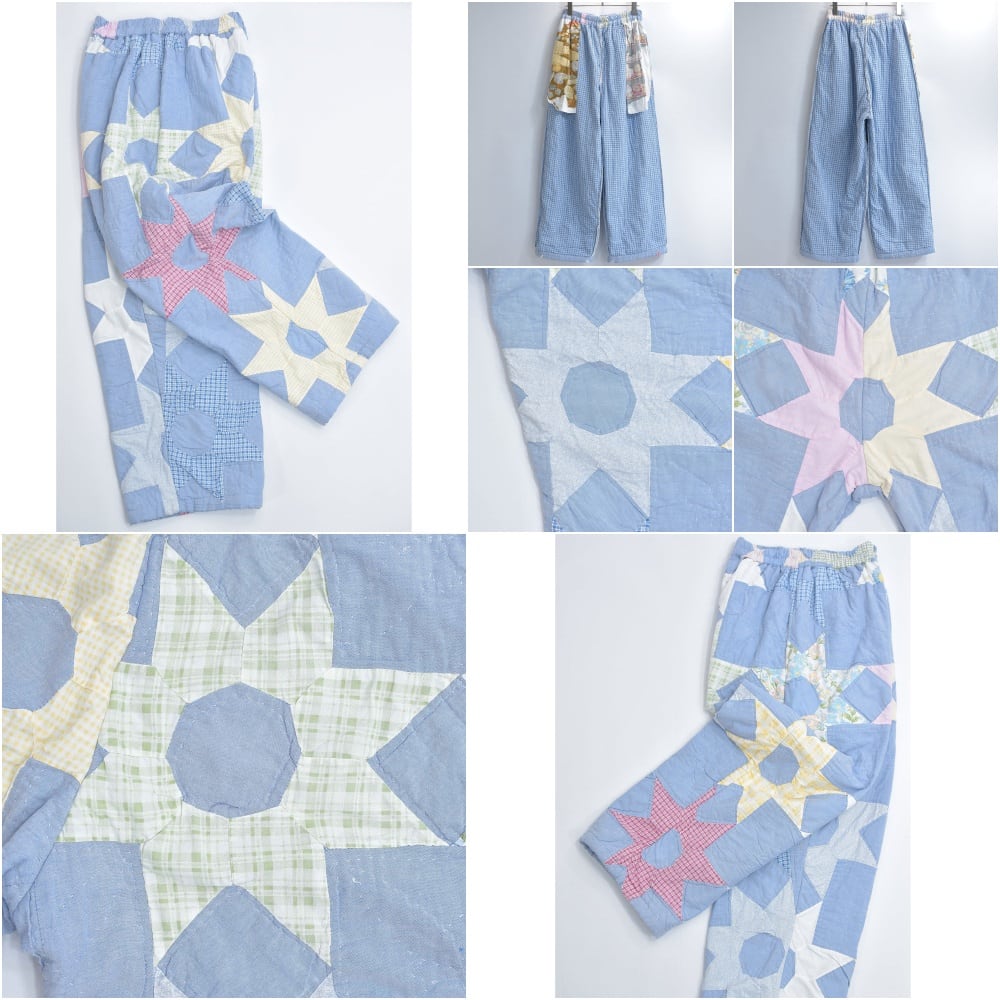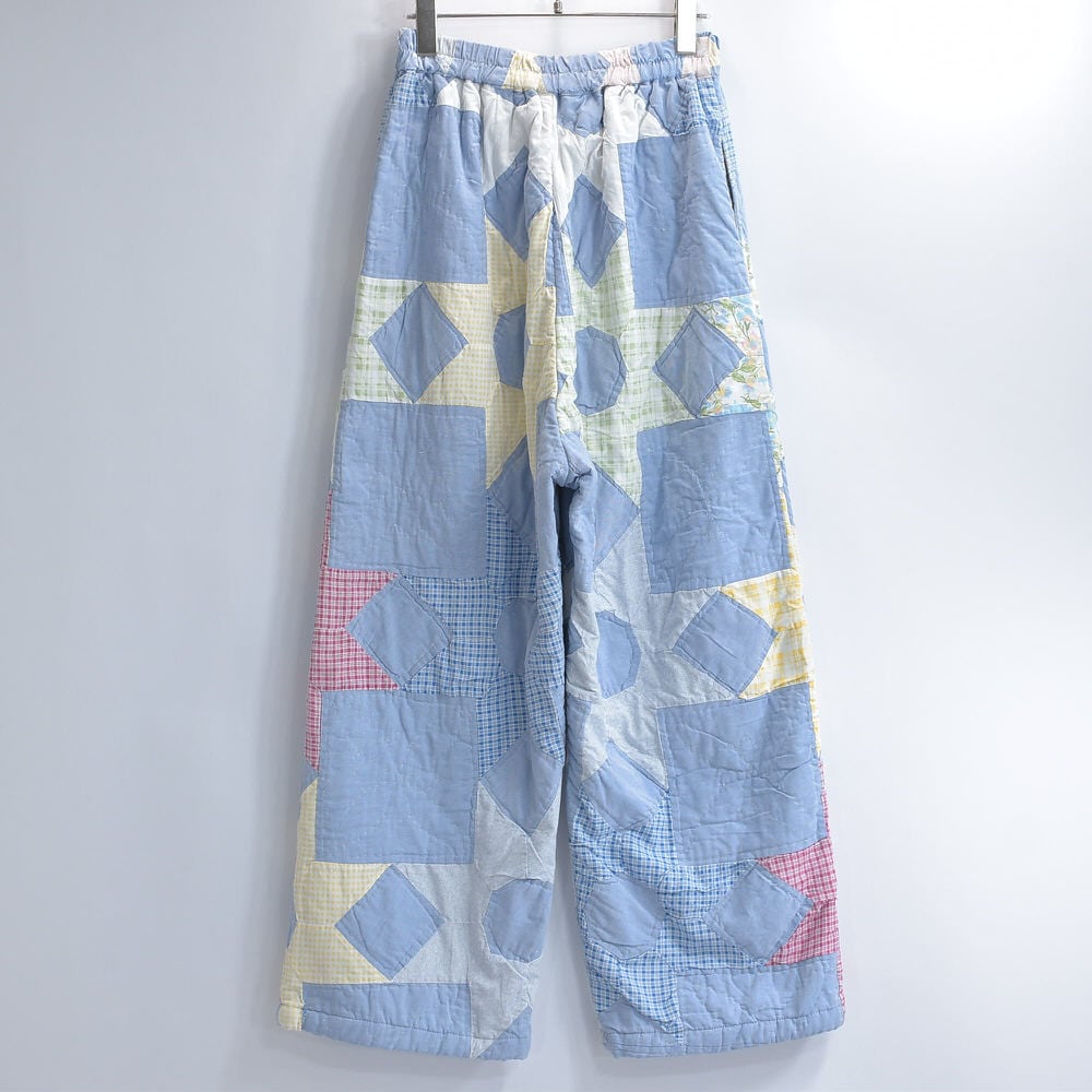Remake リメイク ハンドメイド デザイン パッチワーク キルト ワイドシルエット イージーパンツ 再構築 ツギハギ ライトブルー W64~104cm