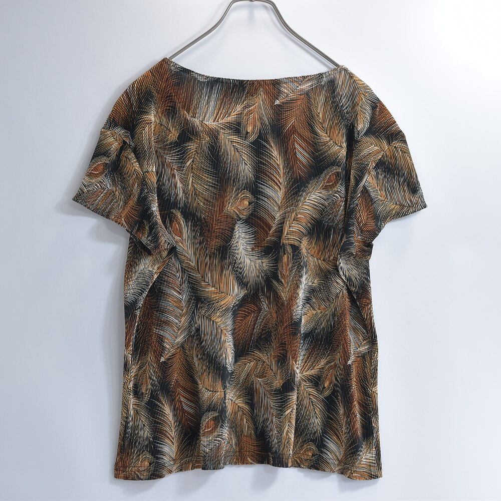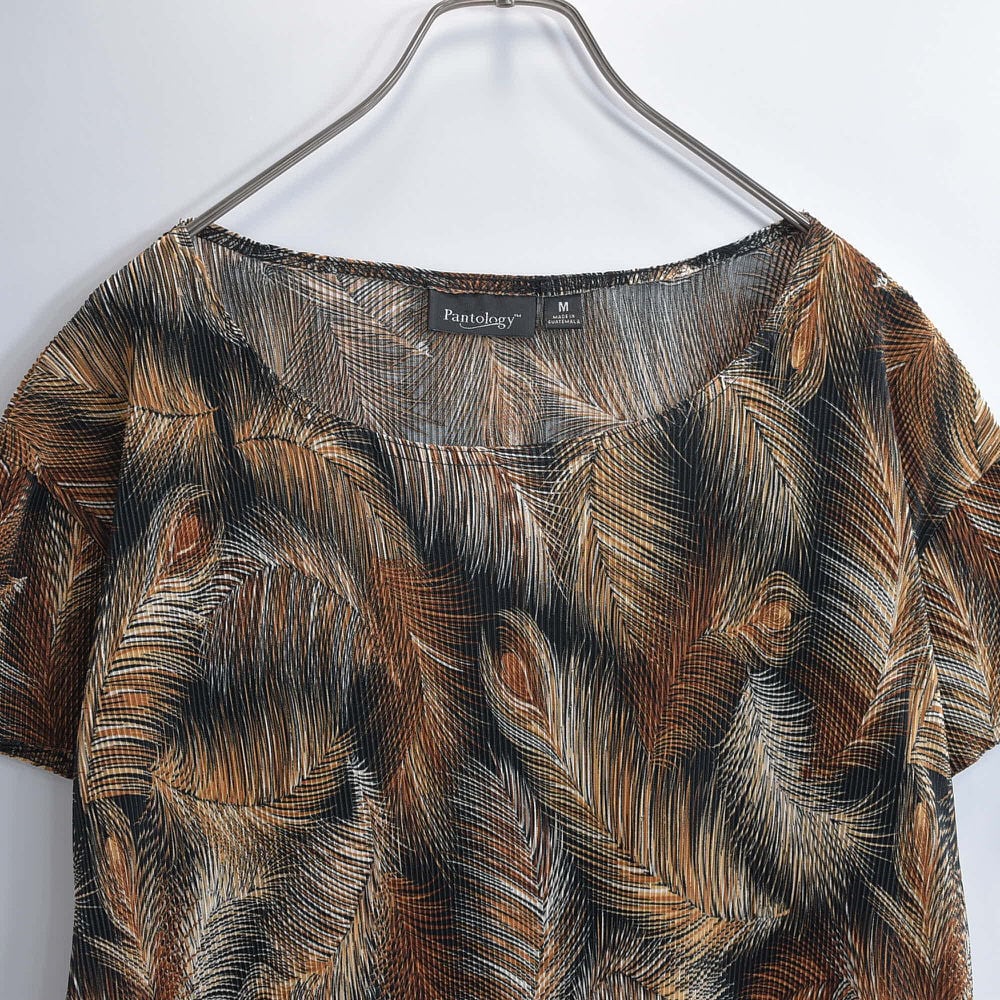 90s~ Pantology パントロジー プリーツ加工 総柄 フェザー 孔雀 デザイン カットソー トップス 羽柄 ヴィンテージ ブラック ブラウン ビンテージ アメリカ古着 レディース L相当