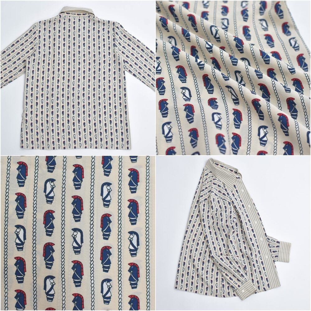 Vintage 日本製 ナイト 総柄デザイン ストライプ 長袖 ポリシャツ ブラウス アート 騎士 レトロ ジャパンヴィンテージ アイボリー ビンテージ 古着 レディースXS相当