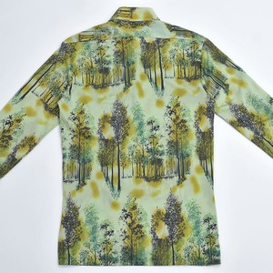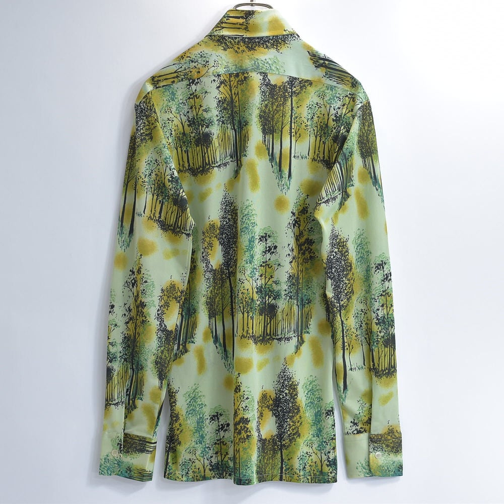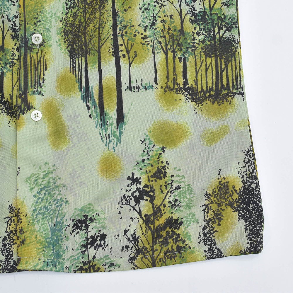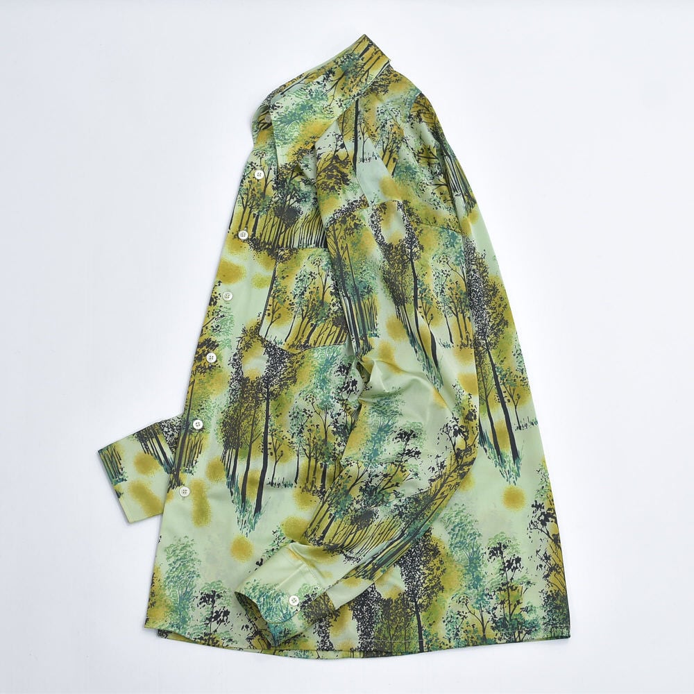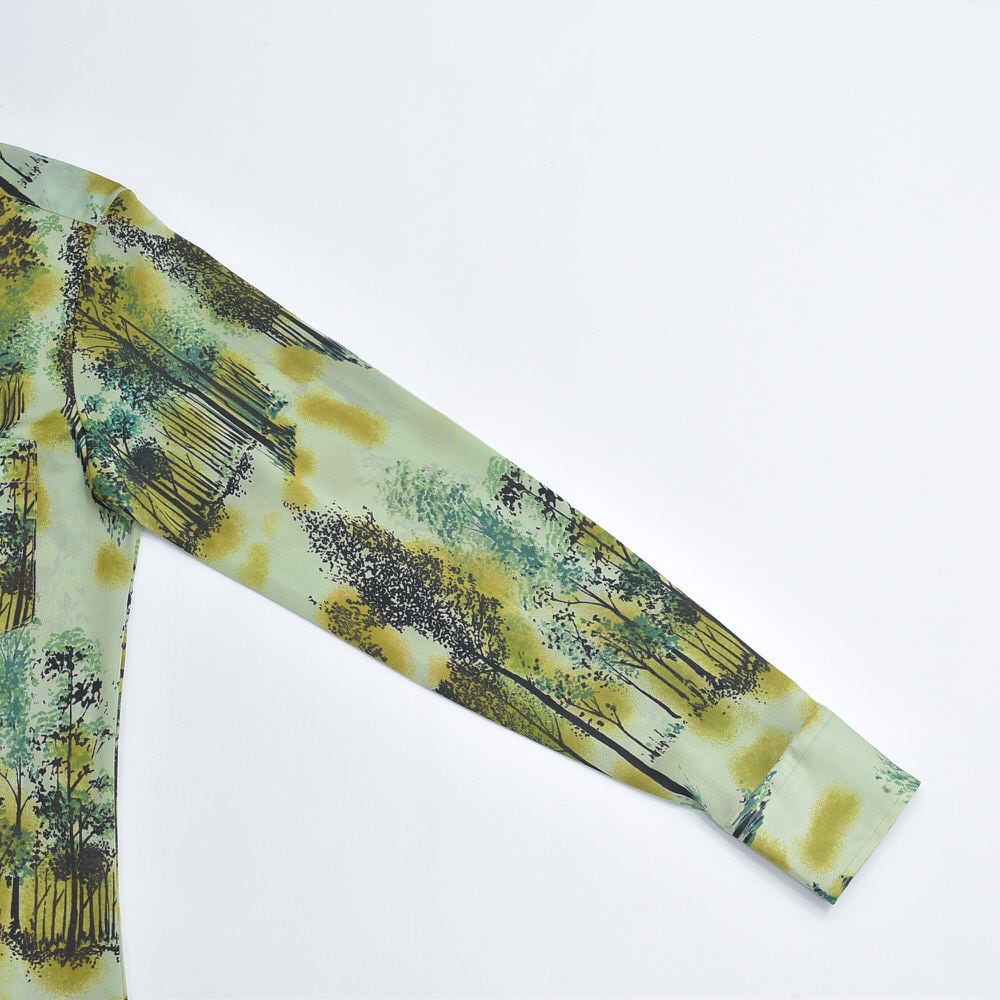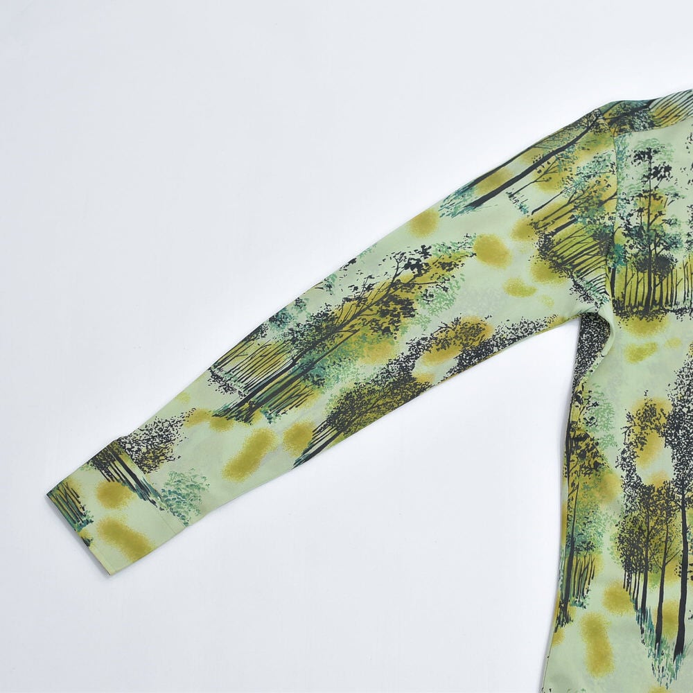 70s Bardon, INC バードン 総柄デザイン アート 長袖 ナイロンシャツ サイケデリック レトロ 風景 ライトグリーン ブラック ヴィンテージ ビンテージ アメリカ古着 メンズ Sサイズ