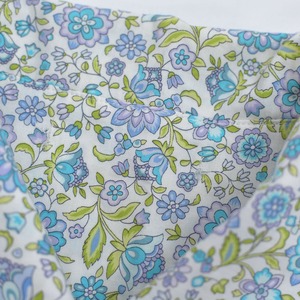 白地に描かれた水色と紫の小さな花々はまるで夜明けの庭から摘んできたかのよう