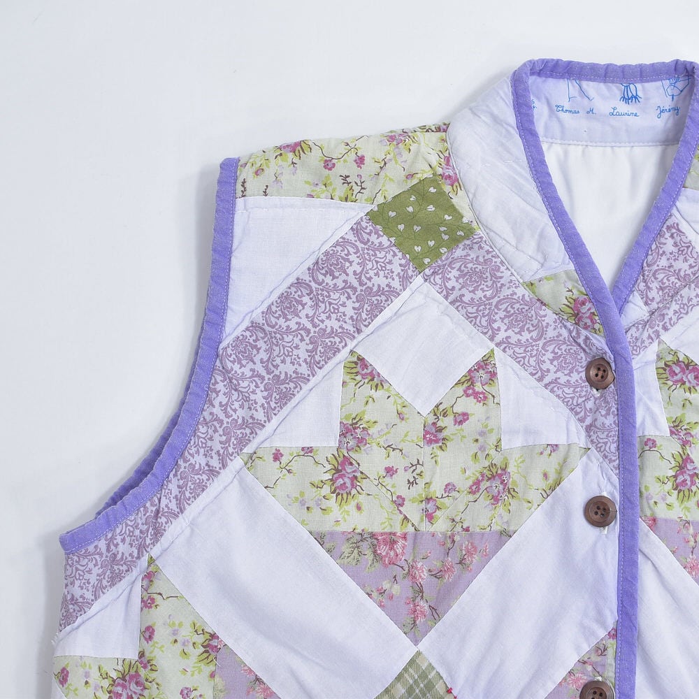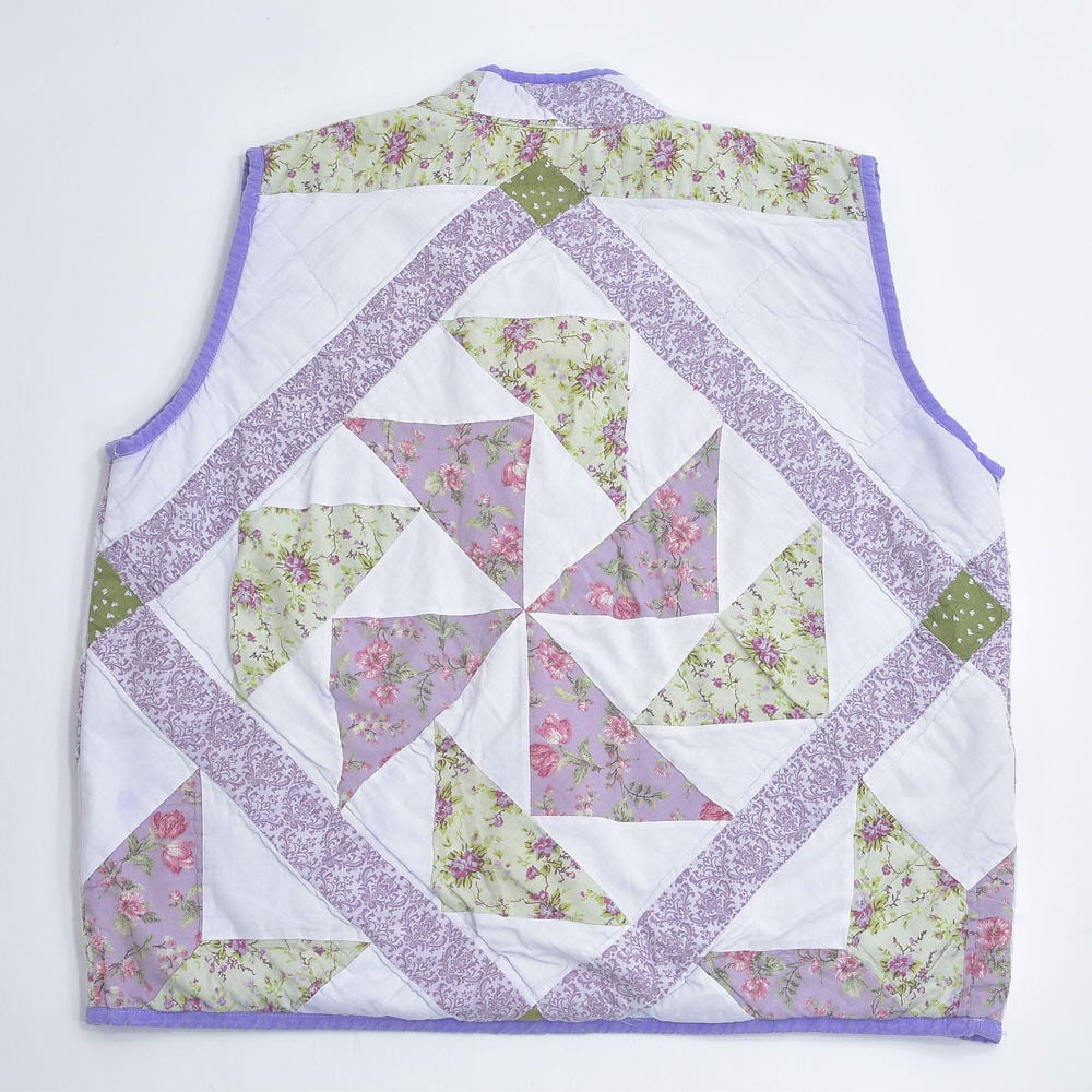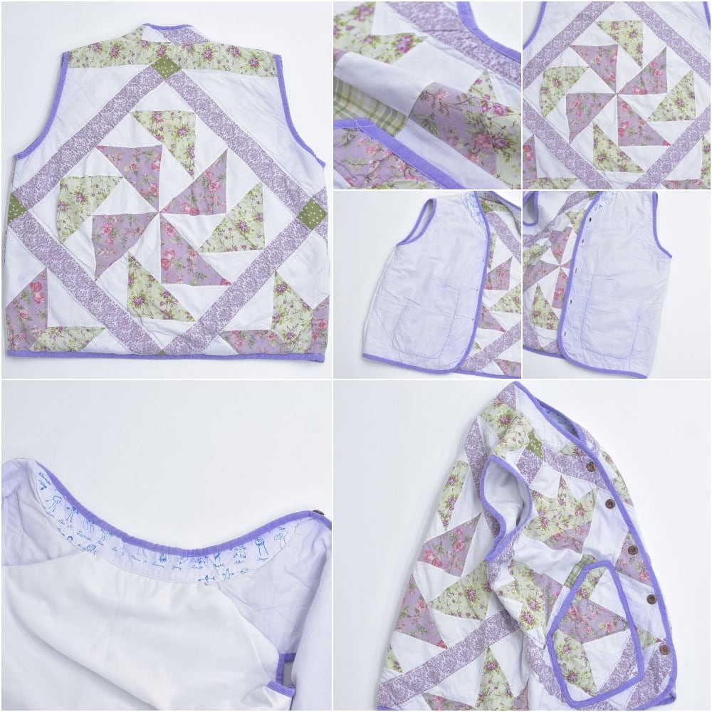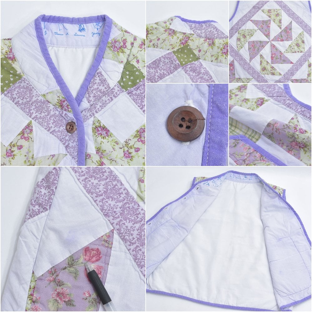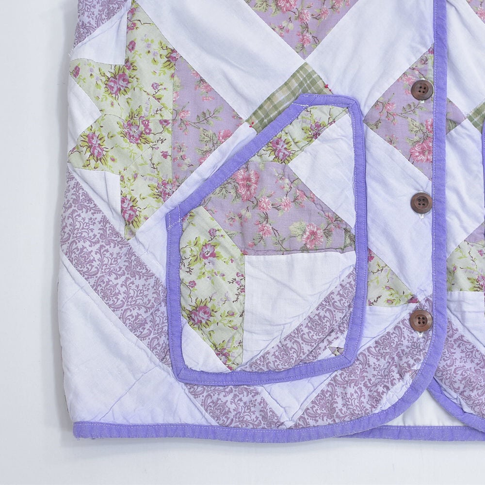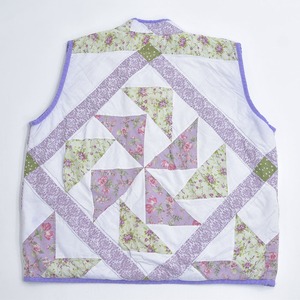 Remake ハンドメイド デザイン リメイク パッチワーク キルト ベスト アウター 再構築 ツギハギ 中綿入り ラベンダー パープル 花柄 レディースXL相当