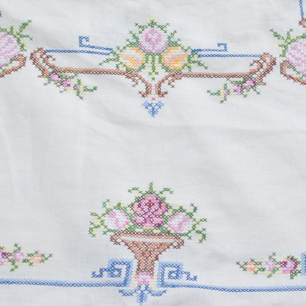 柔らかな風合いを感じるのコットン生地に、ホッと優しい気持ちになれるクロスステッチで描かれたお花の素敵なデザイン