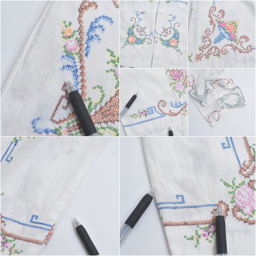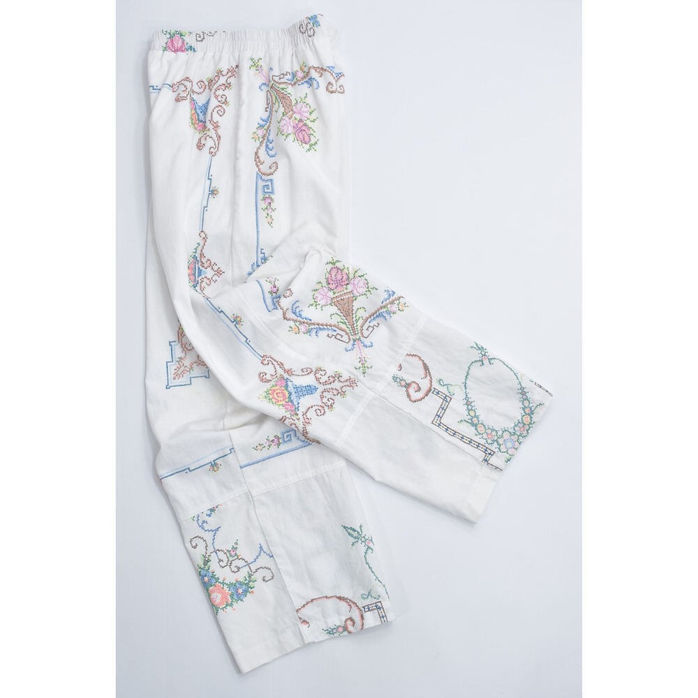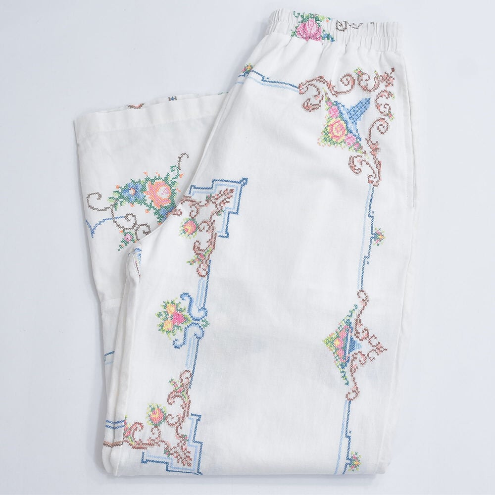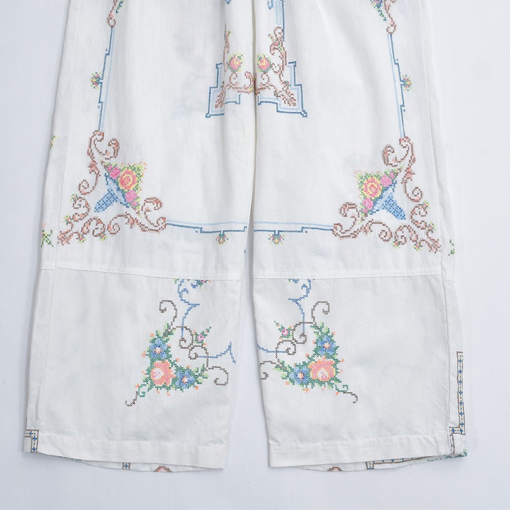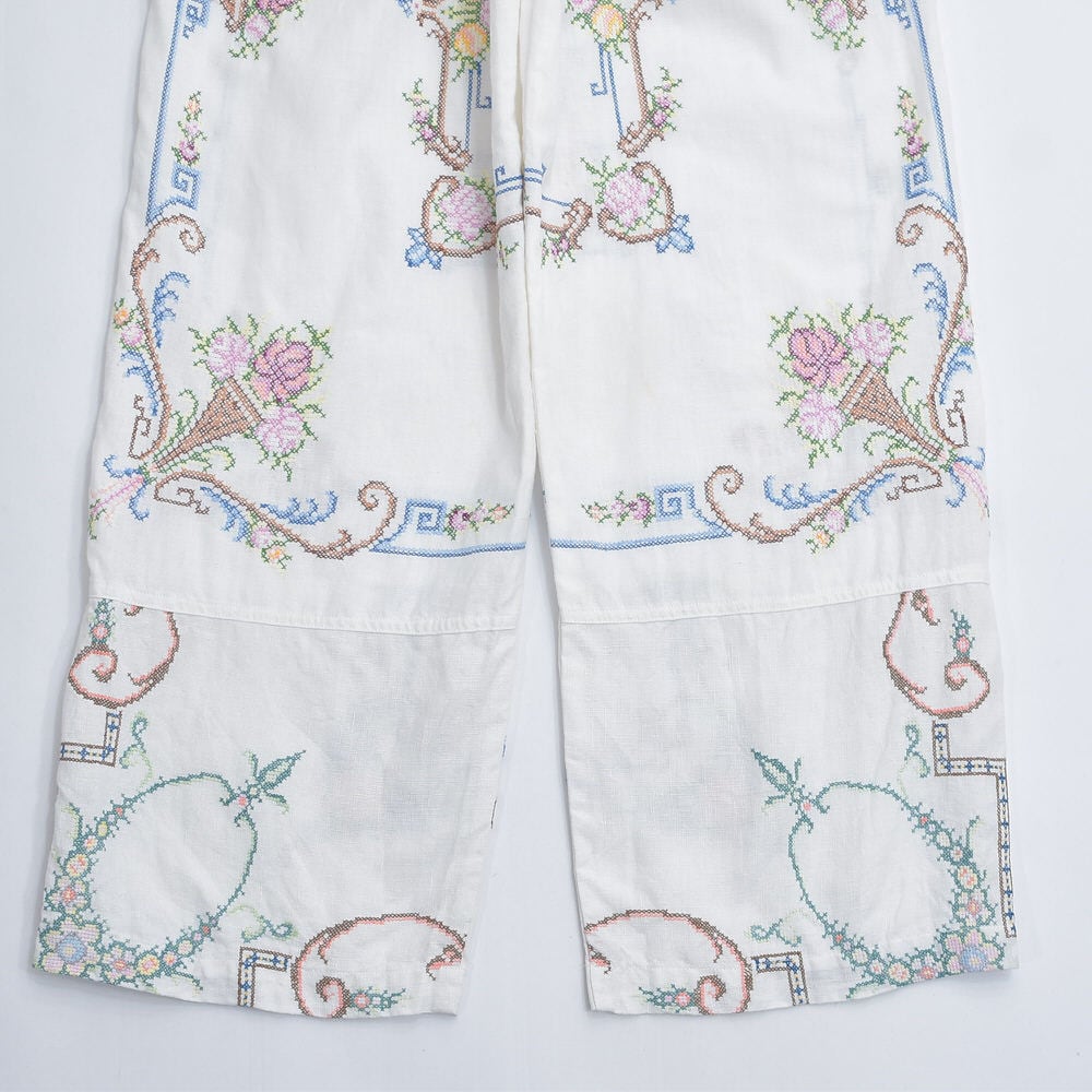 Remakeリメイク 再構築 パッチワーク&フラワー刺繍 デザイン ルーズシルエット コットン イージーパンツ クロスステッチ ホワイト 古着 裏地付き W69~90cm