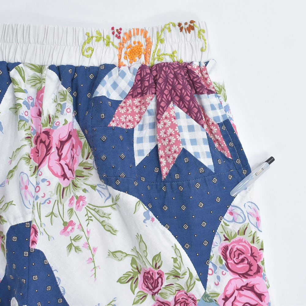 可愛らしい模様がパッチワークのキルトトップ生地をボトムスに再構築したリメイクパンツ