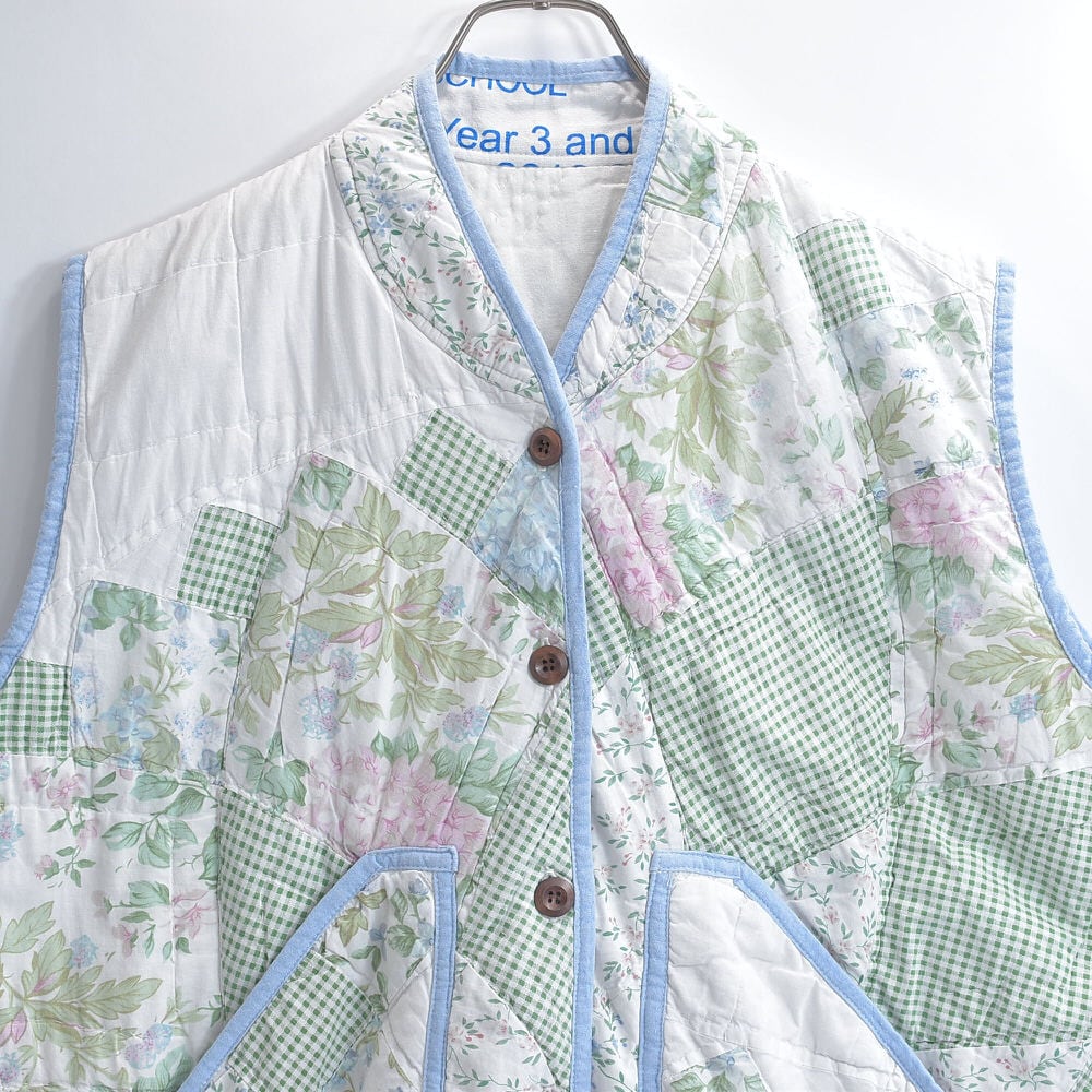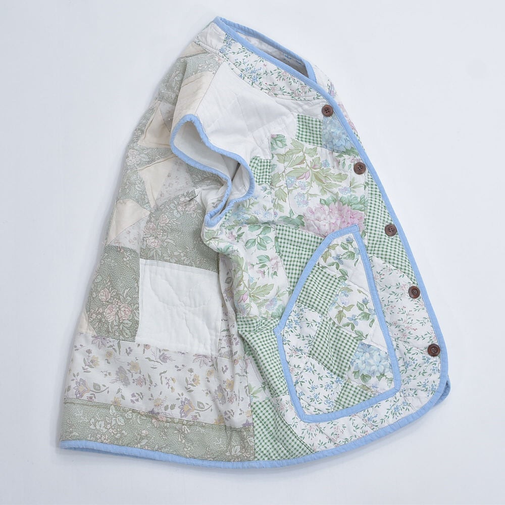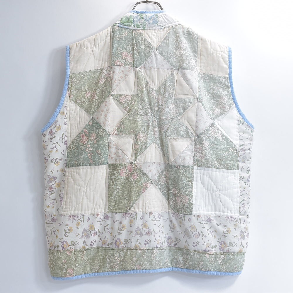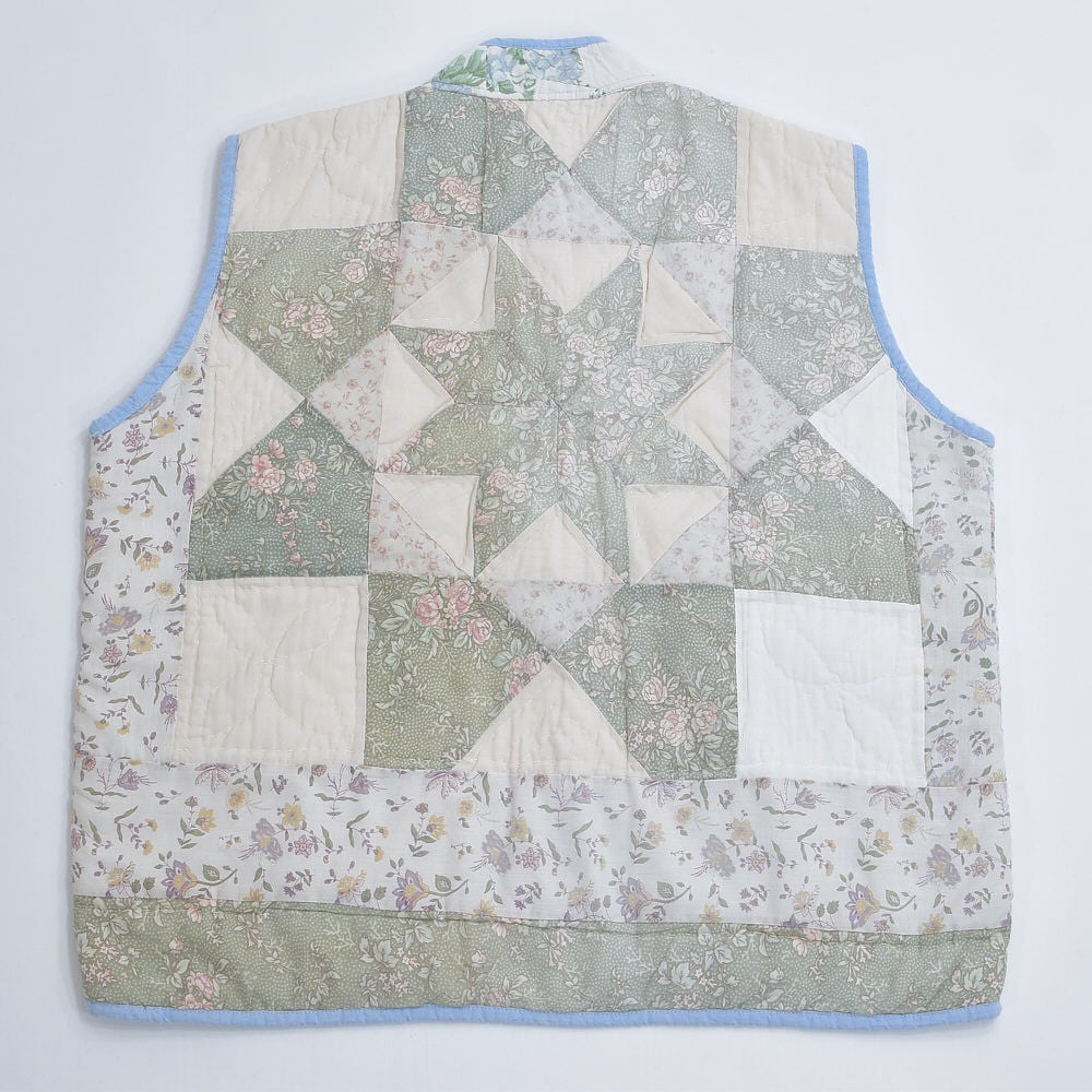 Remake ハンドメイド デザイン リメイク パッチワーク キルト ベスト アウター 再構築 ツギハギ 中綿入り ホワイト ライトブルー 花柄 レディースXL相当