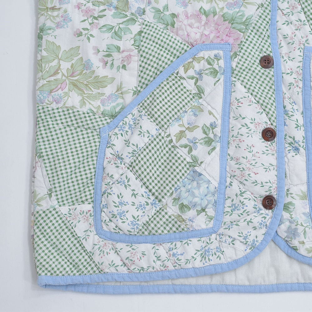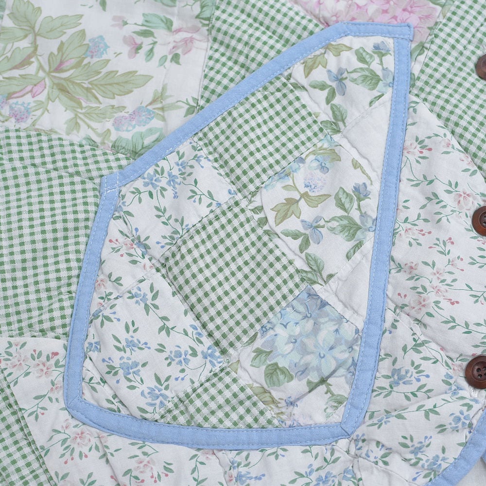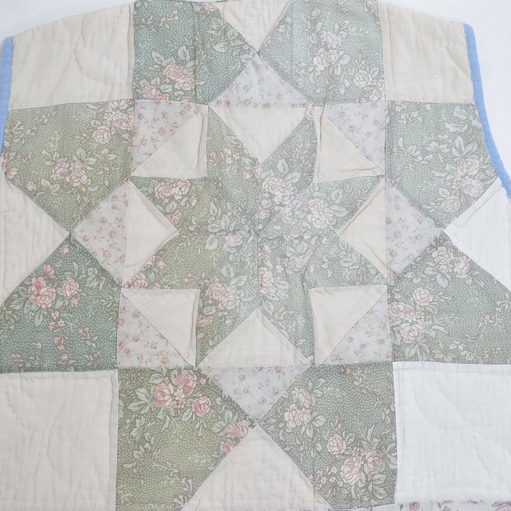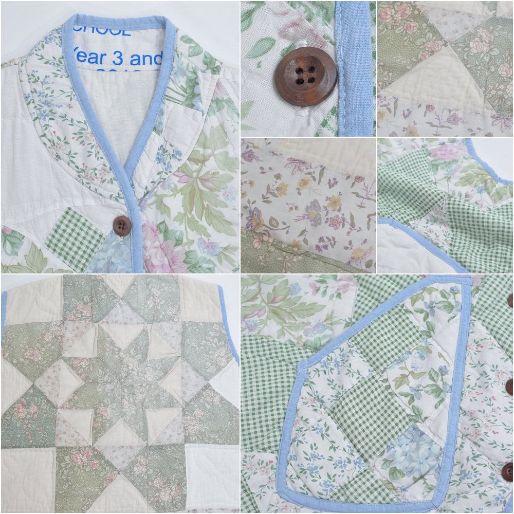 Remake ハンドメイド デザイン リメイク パッチワーク キルト ベスト アウター 再構築 ツギハギ 中綿入り ホワイト ライトブルー 花柄 レディースXL相当