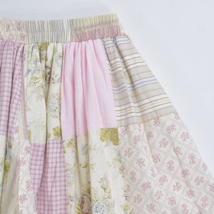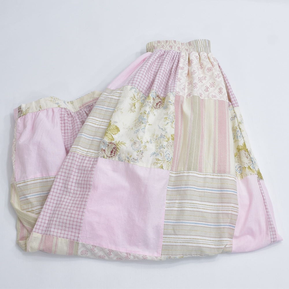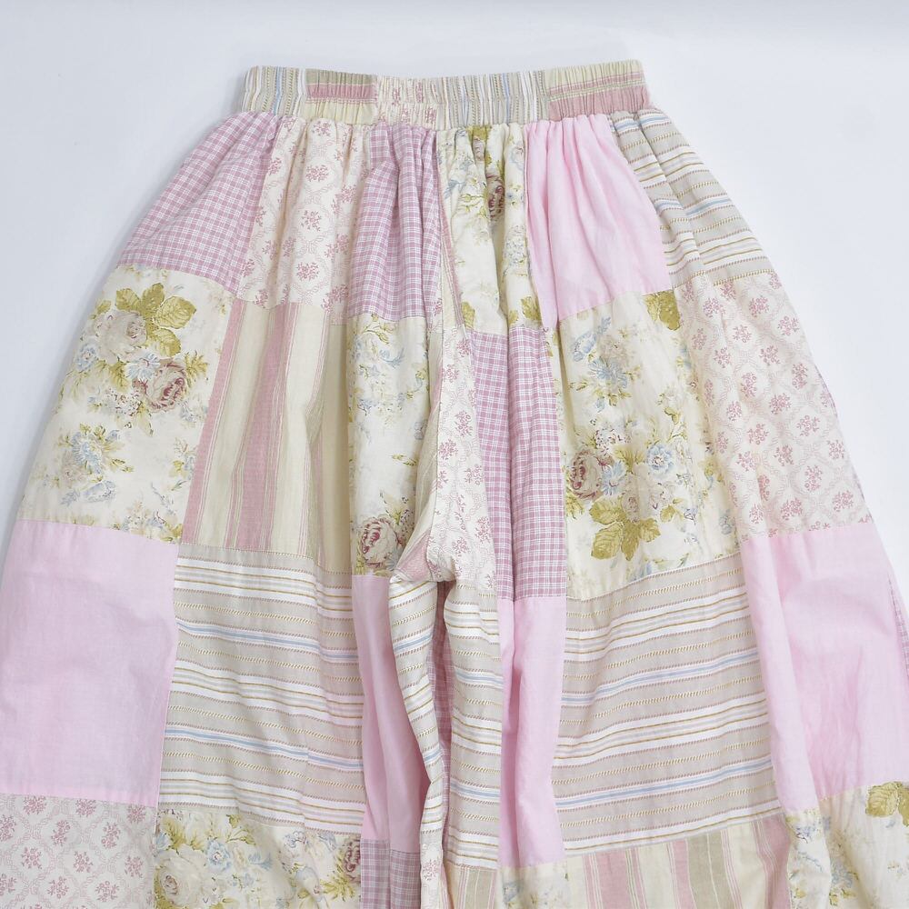 様々な色や柄の生地を繋ぎ合わせ、ボトムスに再構築したパッチワークのキルトトップのリメイクパンツ