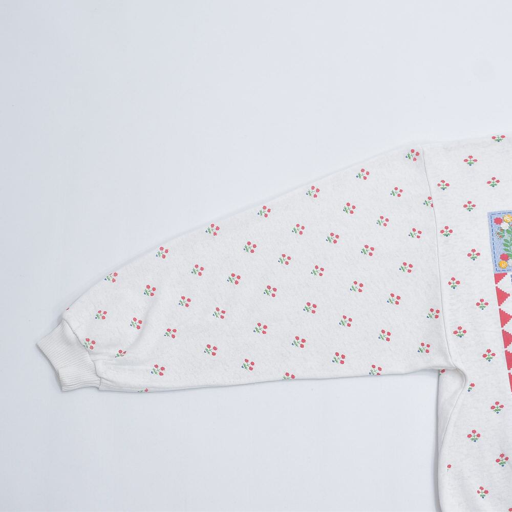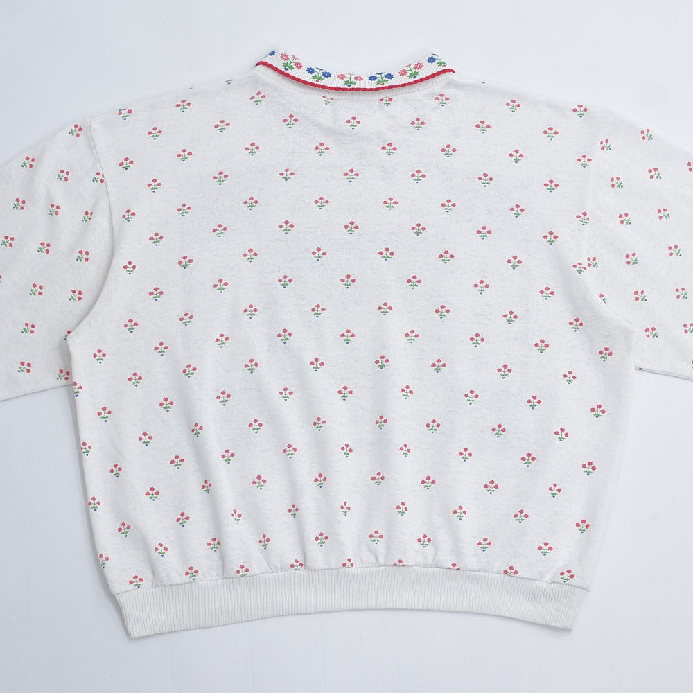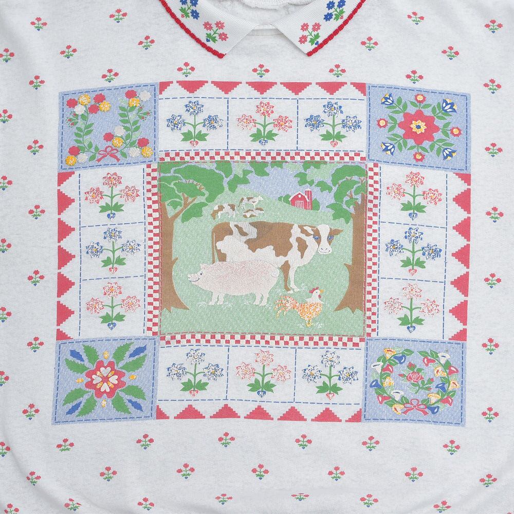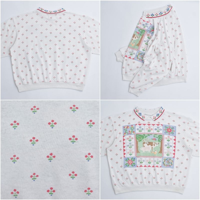 ~90s Used 襟付き アニマルプリント フラワー総柄 デザイン スウェット トレーナー 花柄 動物 カントリー アート ウシさん ヴィンテージ ビンテージ USA アメリカ古着 レディースXL相当
