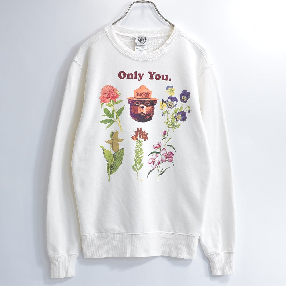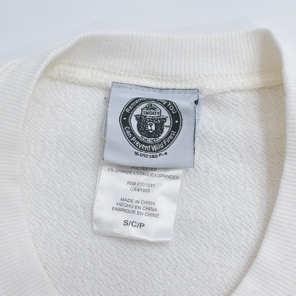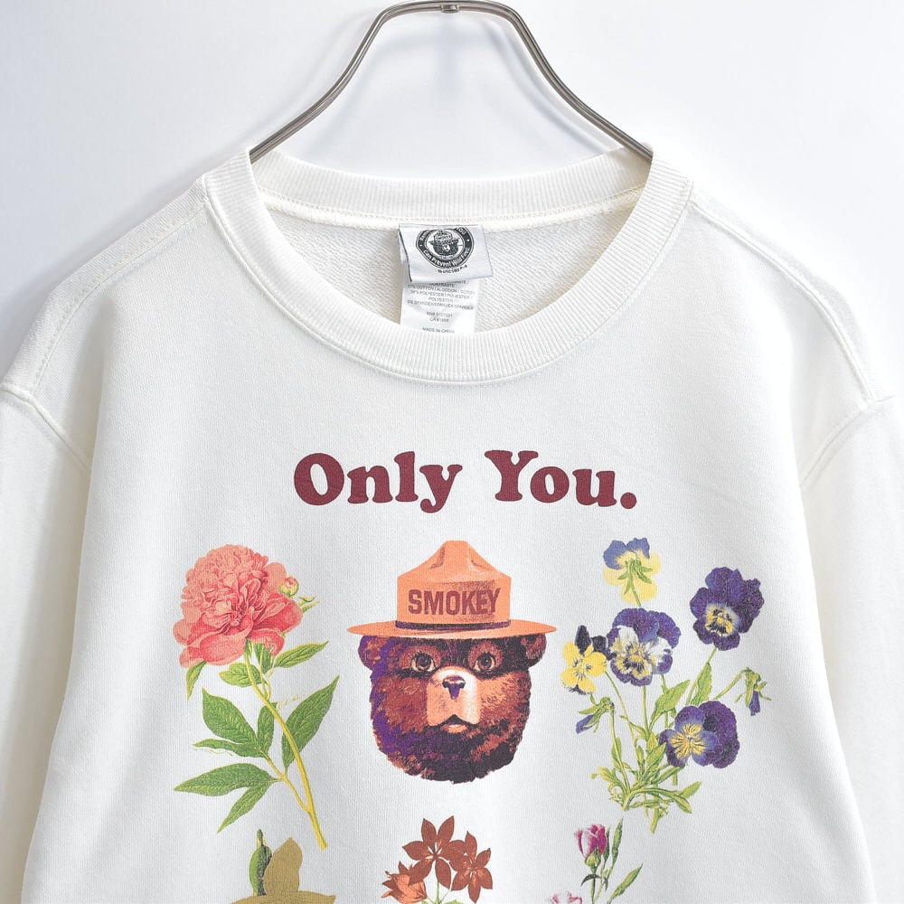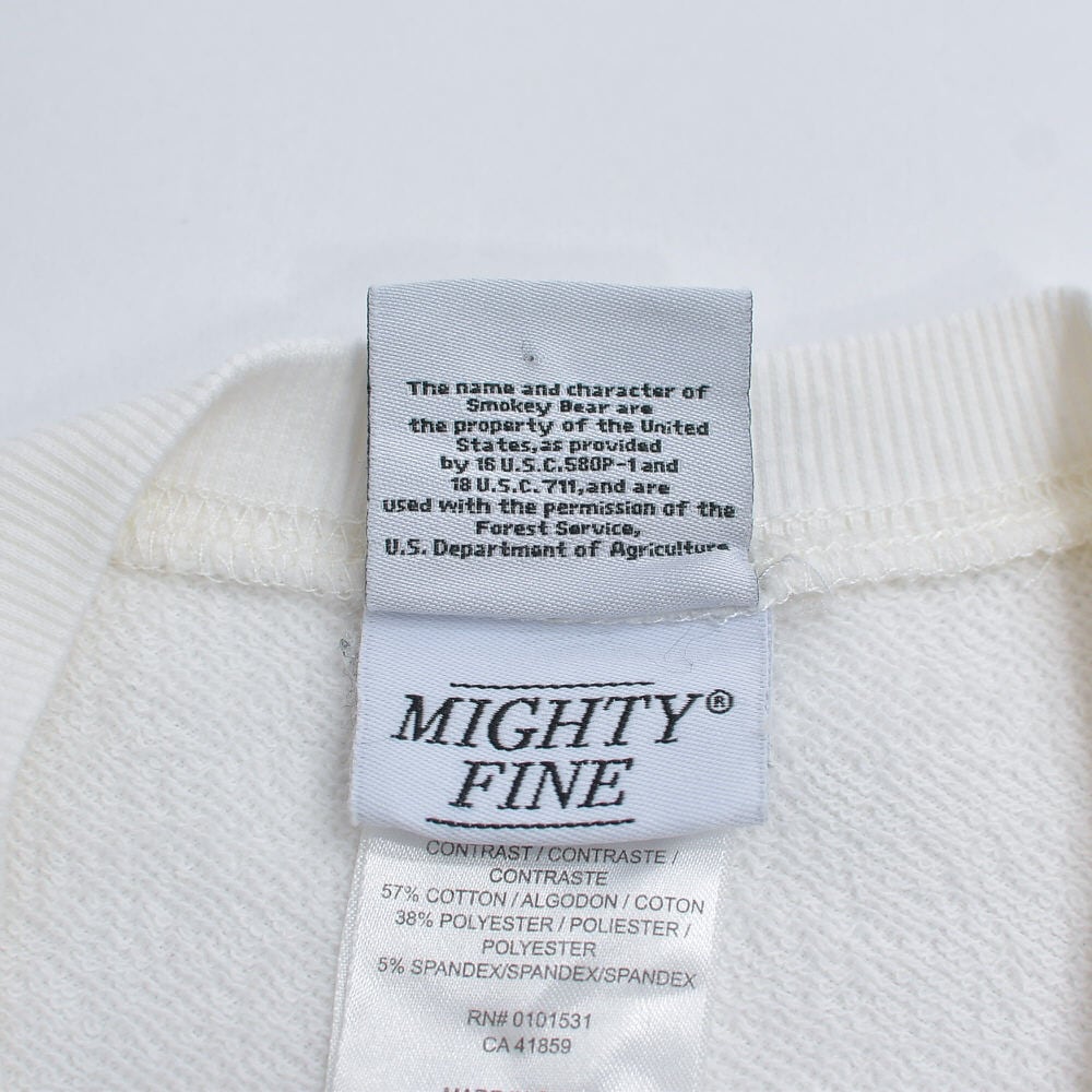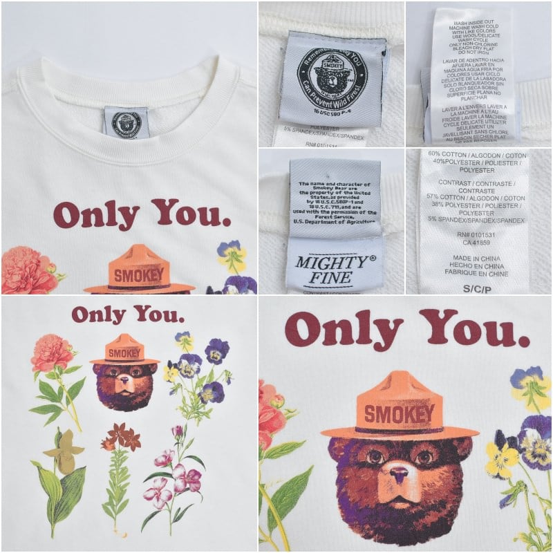 00s MIGHTY FINE マイティファイン スモーキーベア 公式ライセンス キャラクター アニマル ボタニカル プリント スウェット トレーナー オフホワイト ヴィンテージ ビンテージ USA アメリカ古着 メンズ Sサイズ