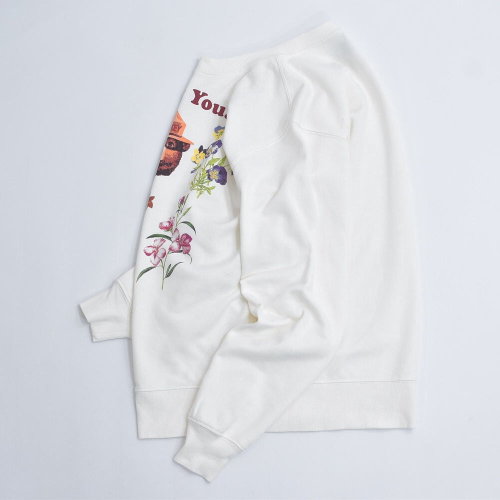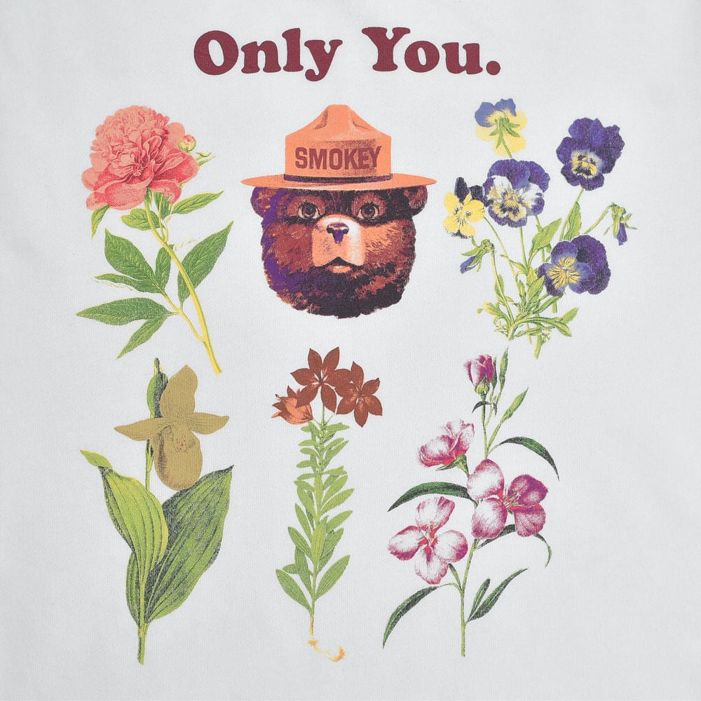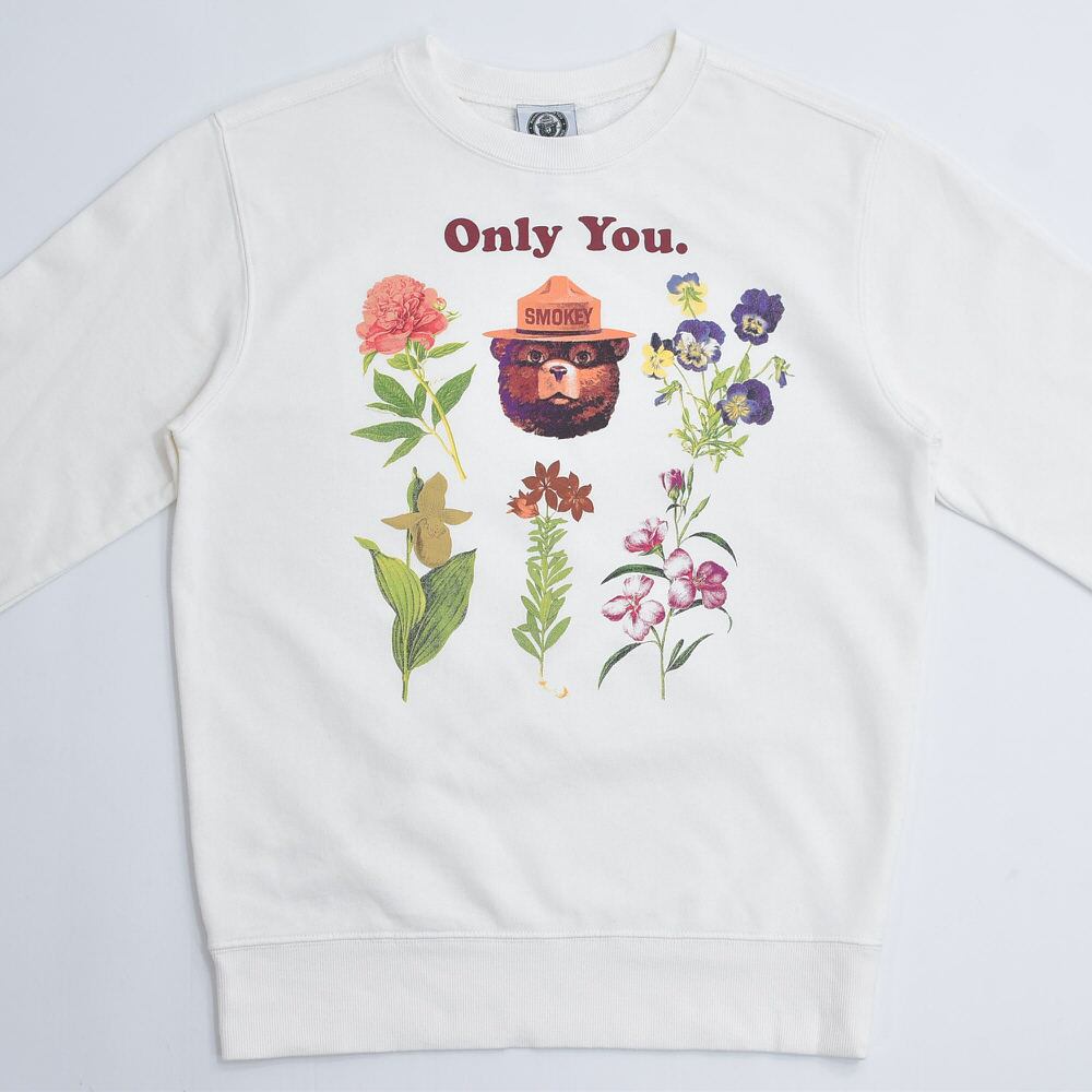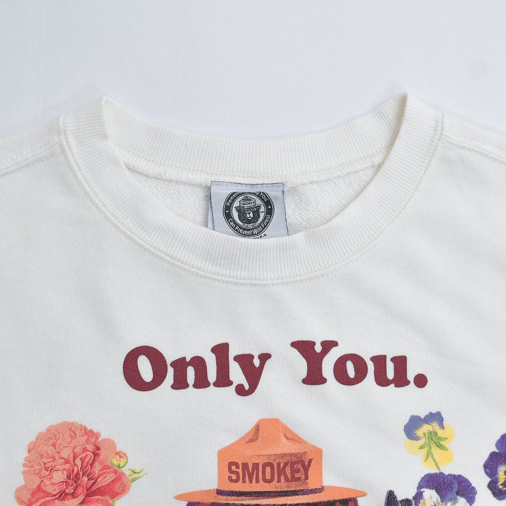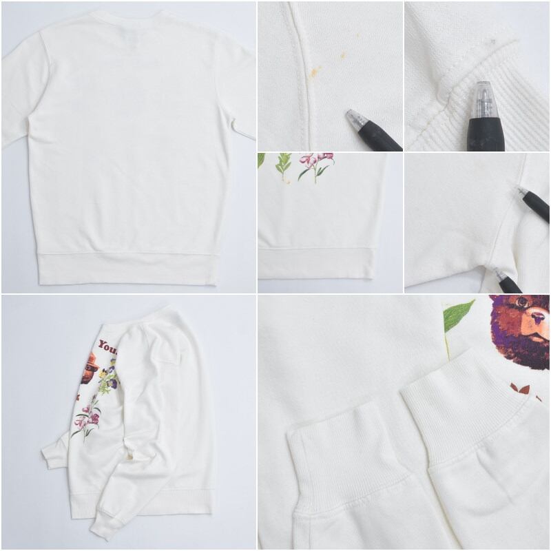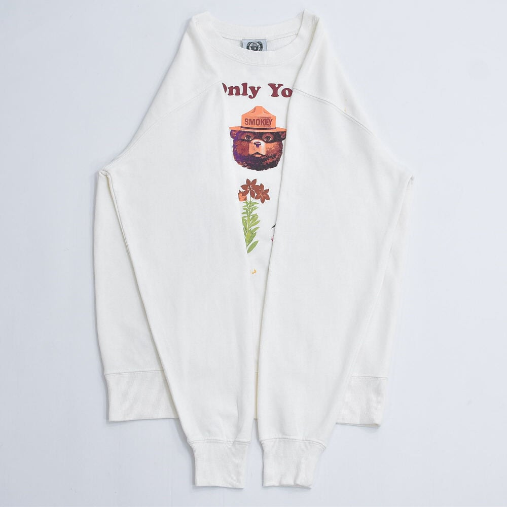 00s MIGHTY FINE マイティファイン スモーキーベア 公式ライセンス キャラクター アニマル ボタニカル プリント スウェット トレーナー オフホワイト ヴィンテージ ビンテージ USA アメリカ古着 メンズ Sサイズ