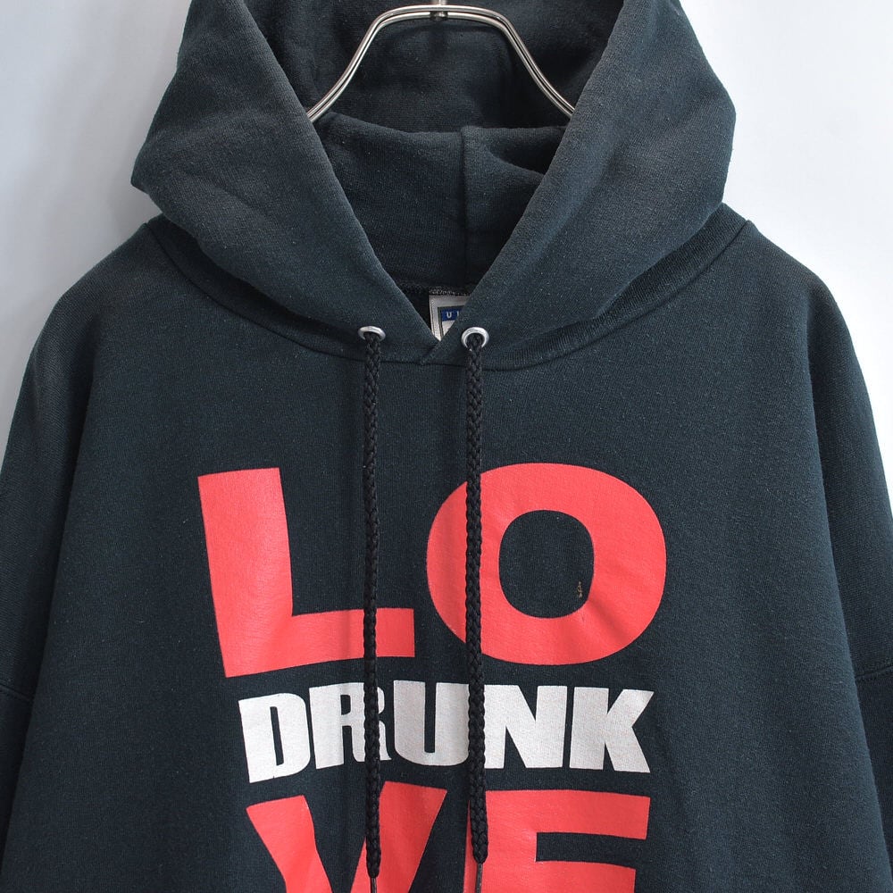 90s Hanes ヘインズ ロゴプリント プルオーバー スウェットパーカー フーディー LOVE DRUNK ブラック ヴィンテージ ビンテージ USA アメリカ古着 メンズ XL~相当