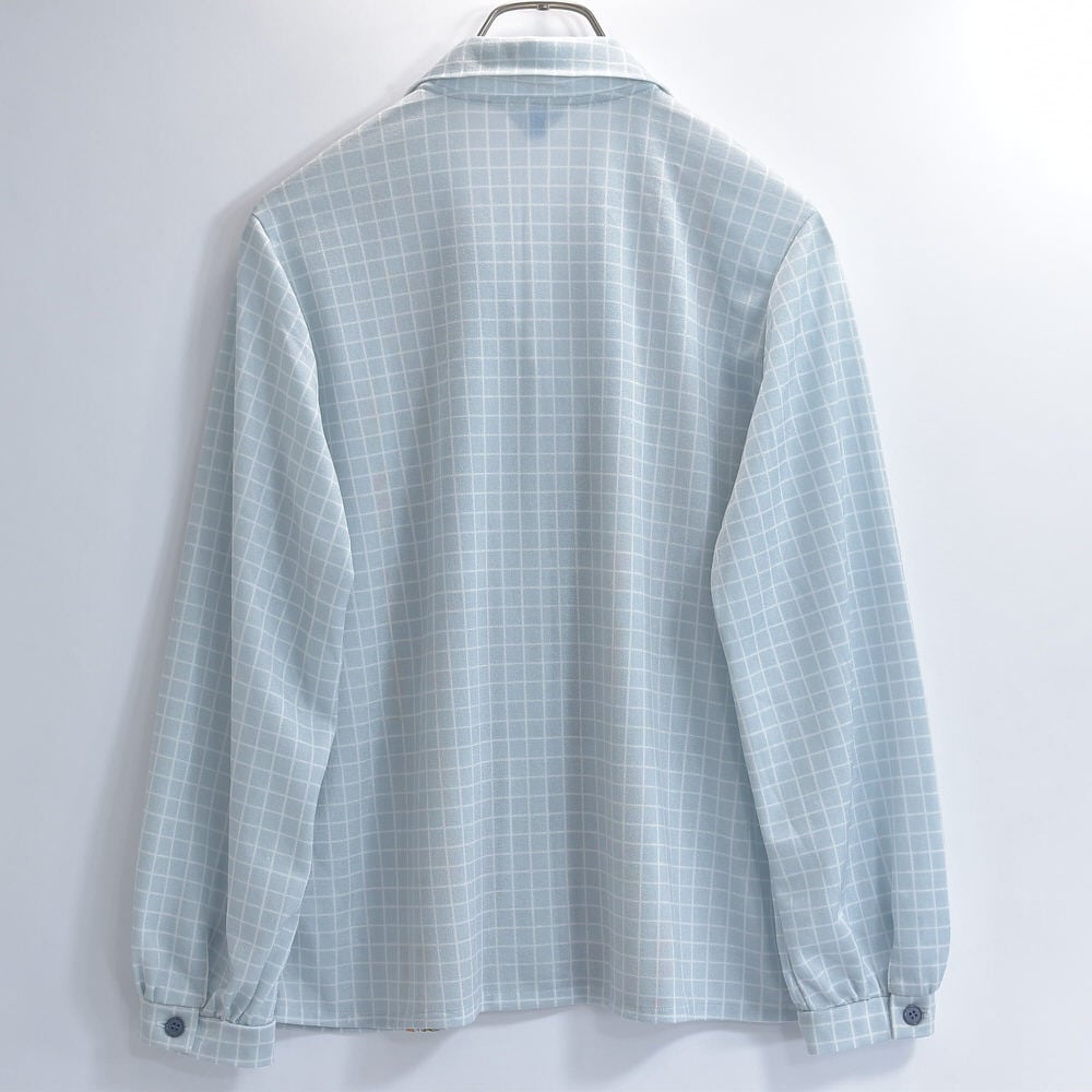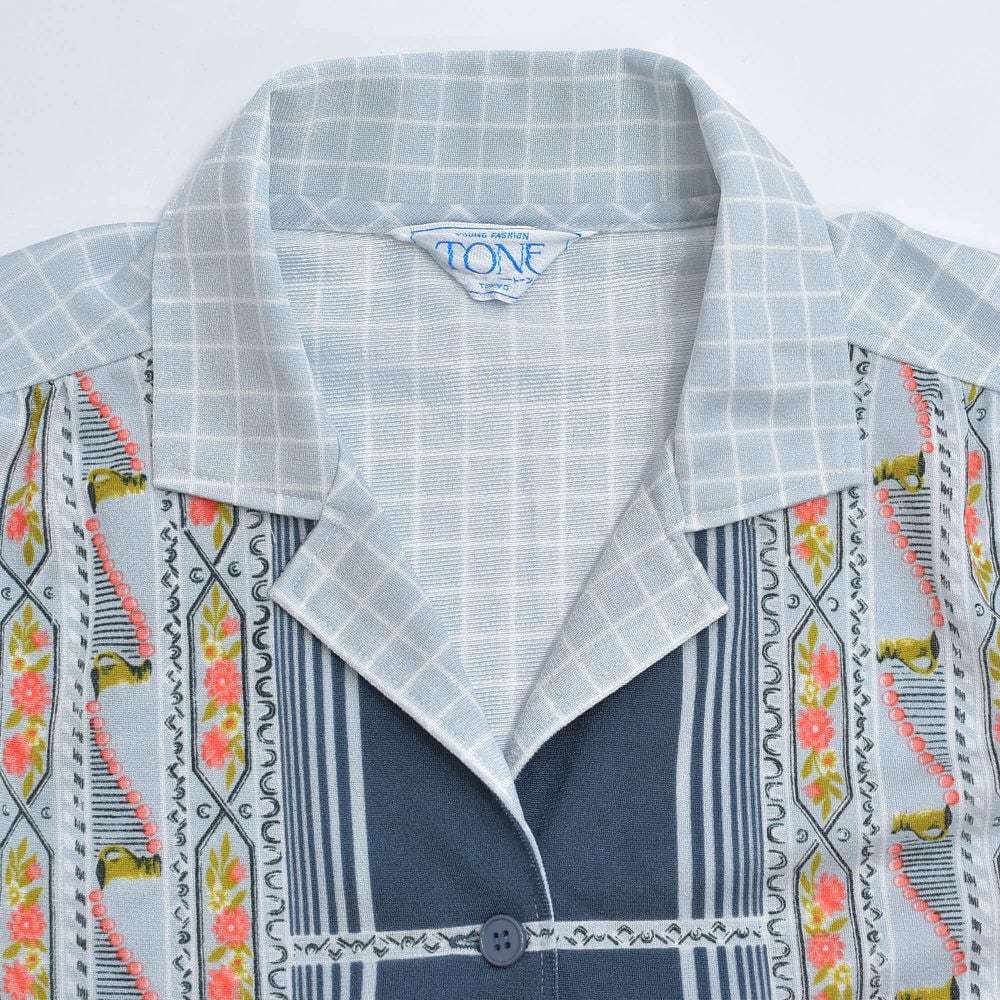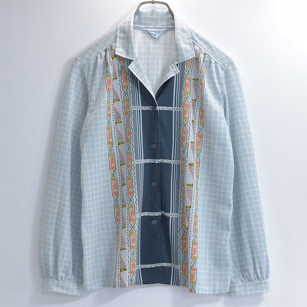 70~80s TONE オープンカラー パネルデザイン 総柄 ポリシャツ 格子柄 幾何学模様 花柄 モチーフ ブラウス 昭和レトロ ジャパンヴィンテージ ビンテージ 古着 レディースM相当