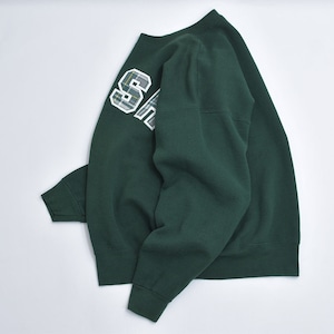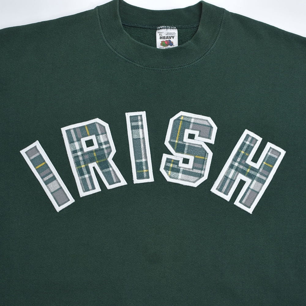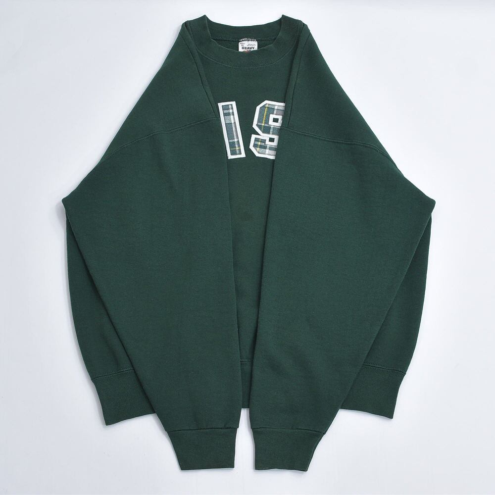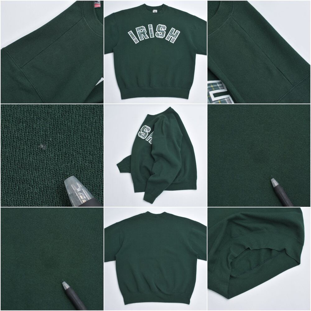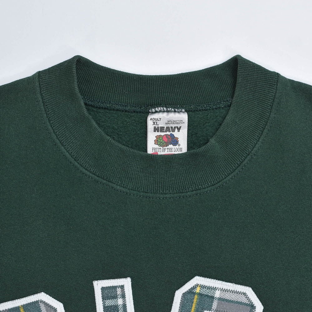90s USA製 FRUIT OF THE LOOM フルーツオブザルーム チェック柄 アップリケ デザイン カレッジロゴ スウェットシャツ トレーナー パッチワーク ダークグリーン ヴィンテージ ビンテージ アメリカ古着 メンズXLサイズ