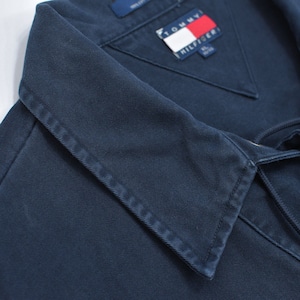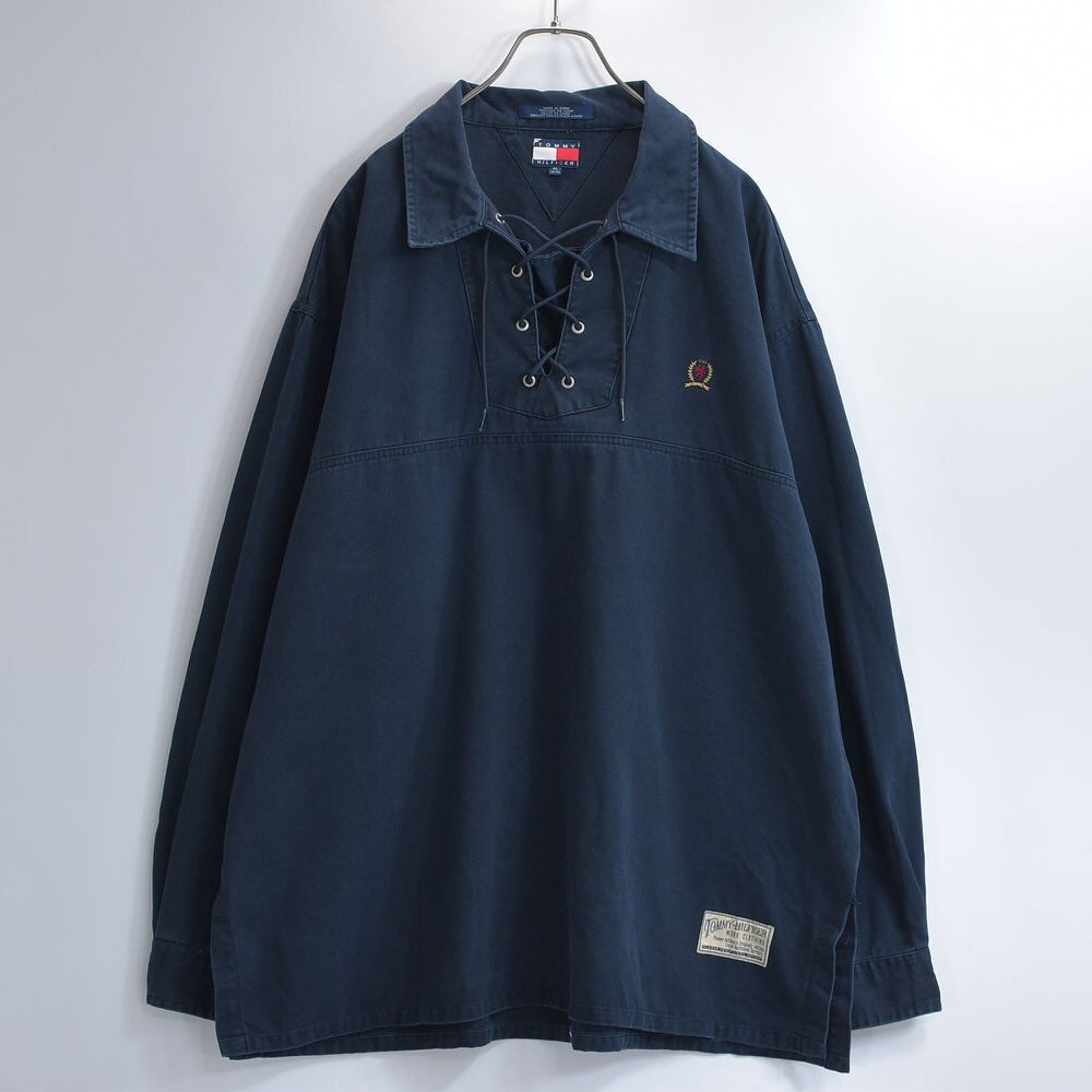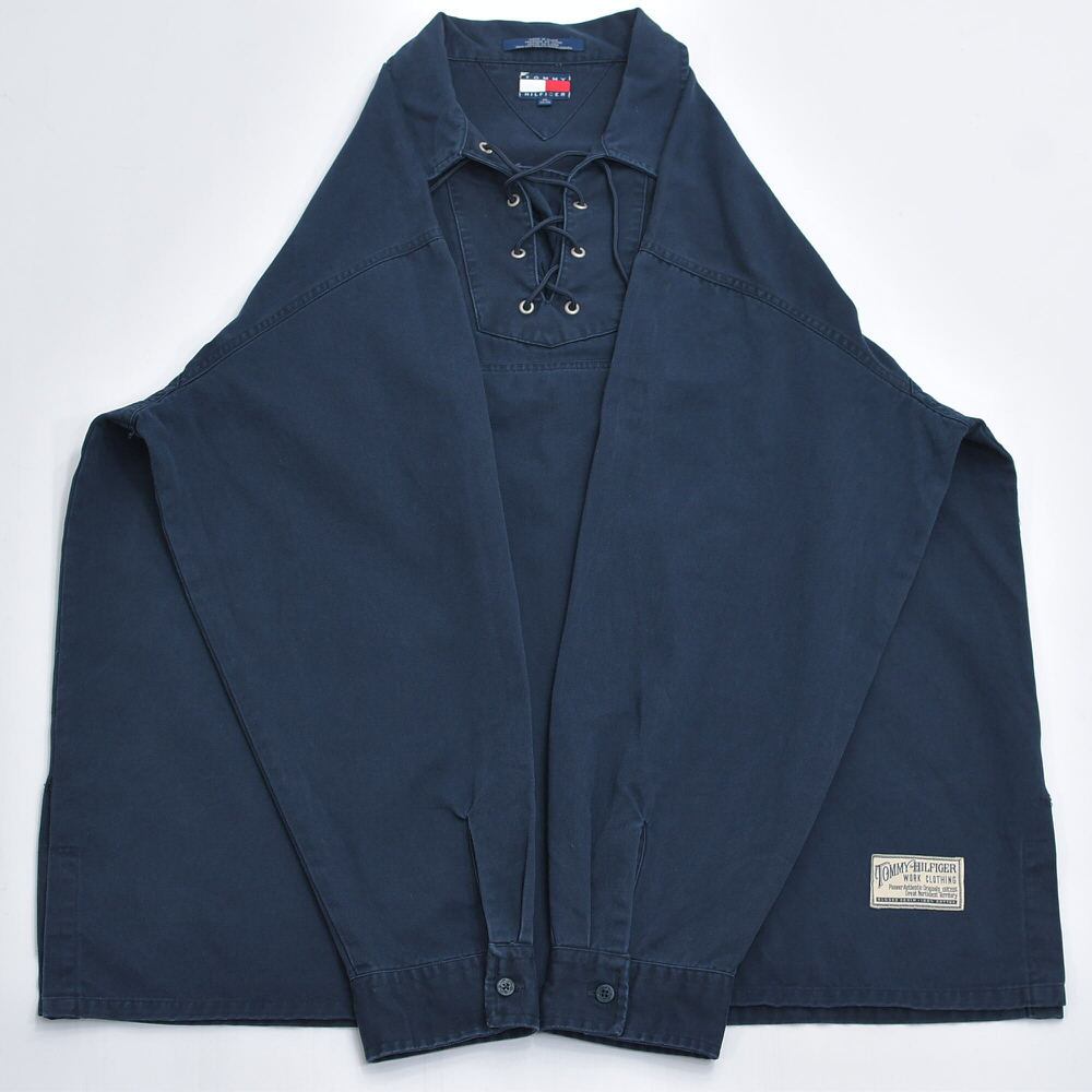90s TOMMY HILFIGER トミーヒルフィガー コットンツイル レースアップ プルオーバーシャツ クレストエンブレム 刺繍 ワークパッチ 紺 ヴィンテージ ビンテージ USA  アメリカ古着 メンズXXL相当