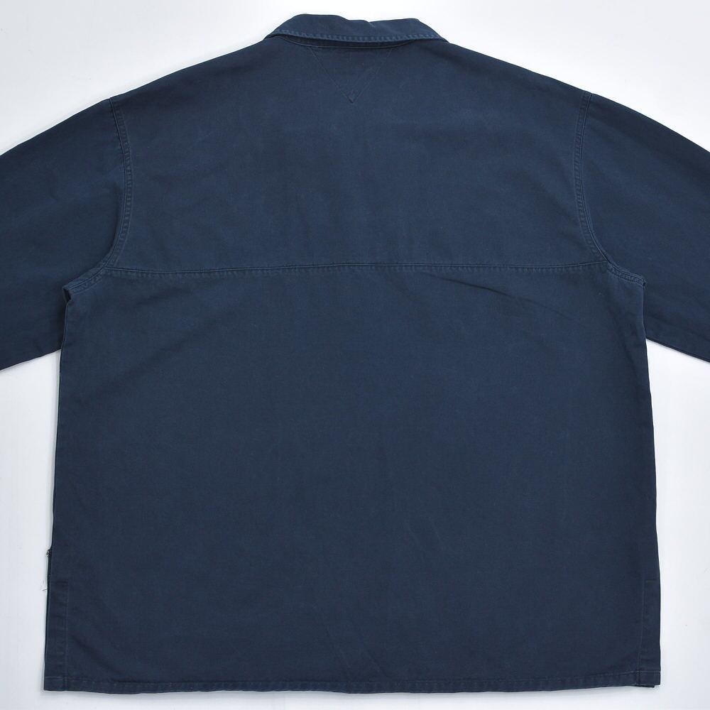 90s TOMMY HILFIGER トミーヒルフィガー コットンツイル レースアップ プルオーバーシャツ クレストエンブレム 刺繍 ワークパッチ 紺 ヴィンテージ ビンテージ USA アメリカ古着 メンズXXL相当
