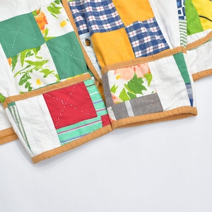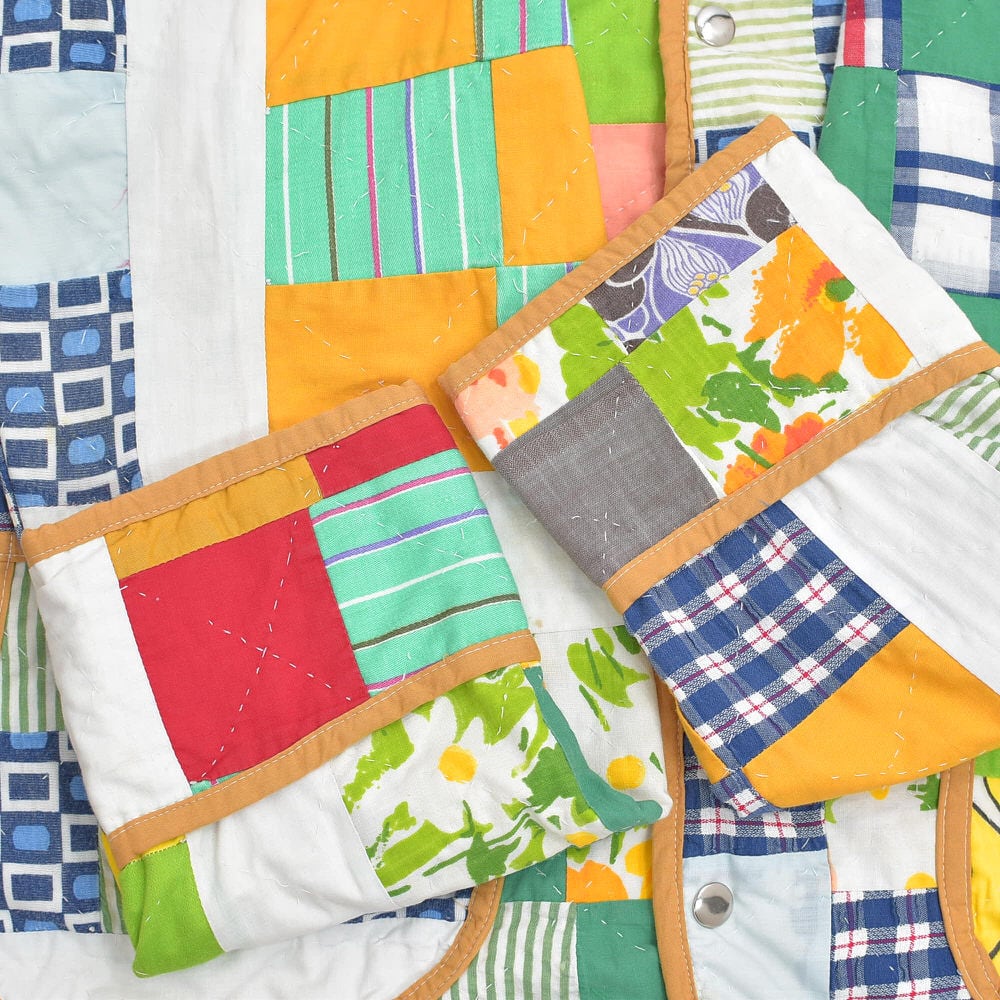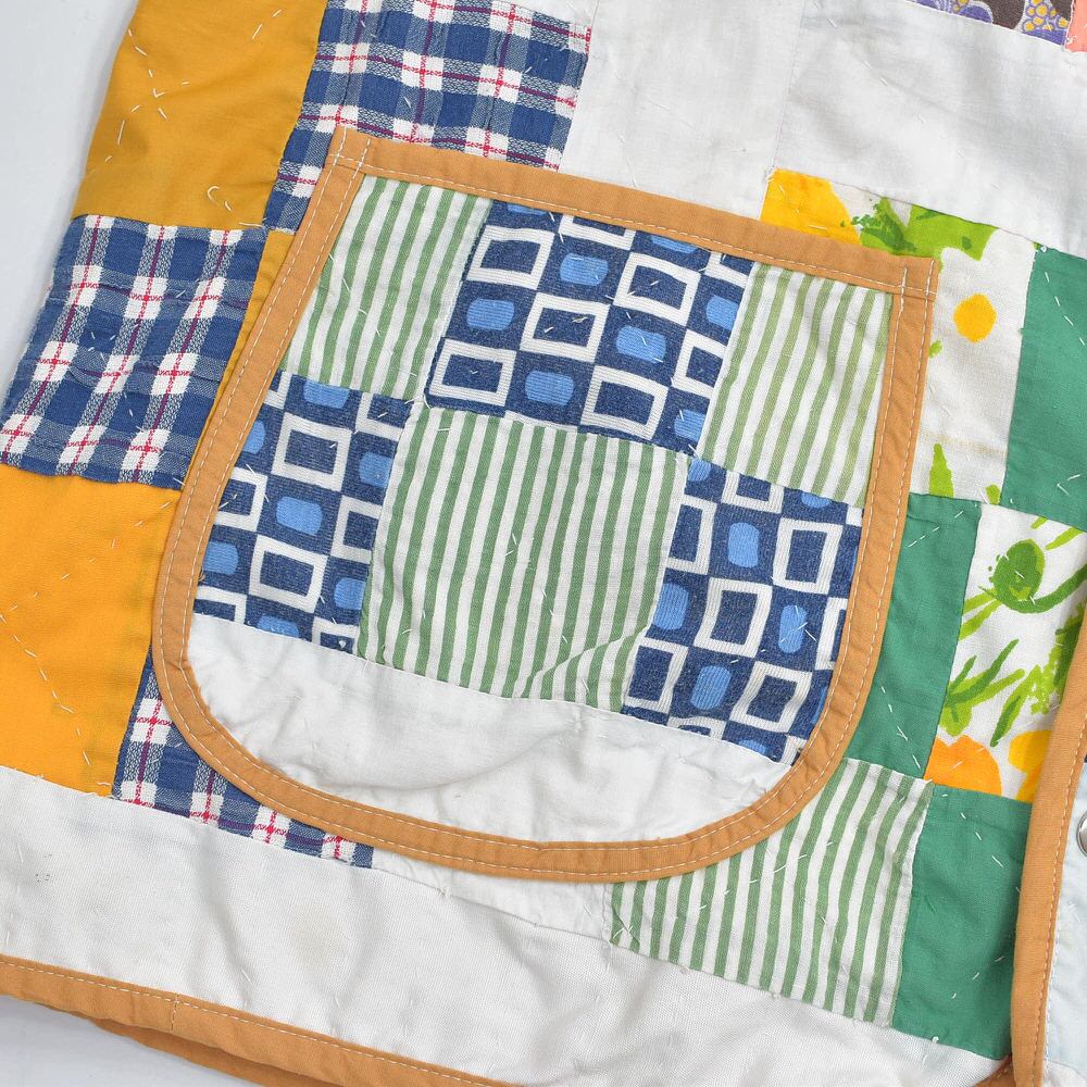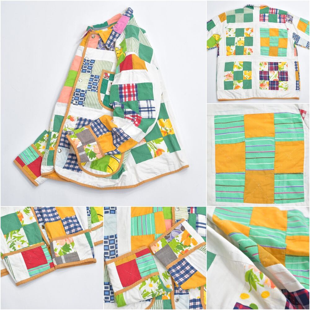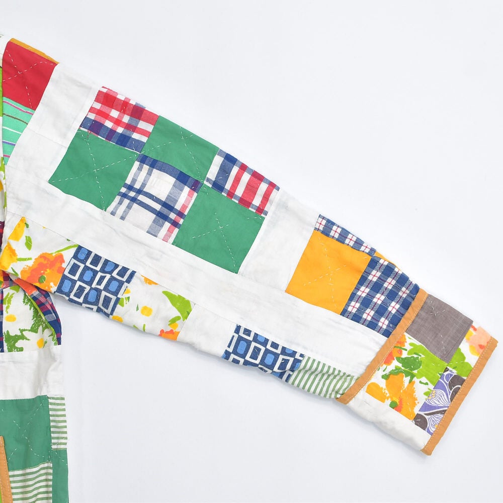 お花やチェック、ストライプ、色々な生地を一枚一枚繋ぎ合わせ、賑やかなジャケットに再構築したパッチワークのジャケット