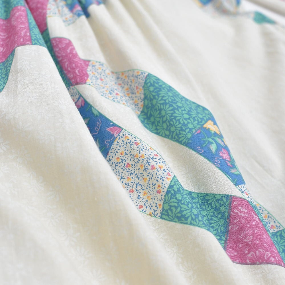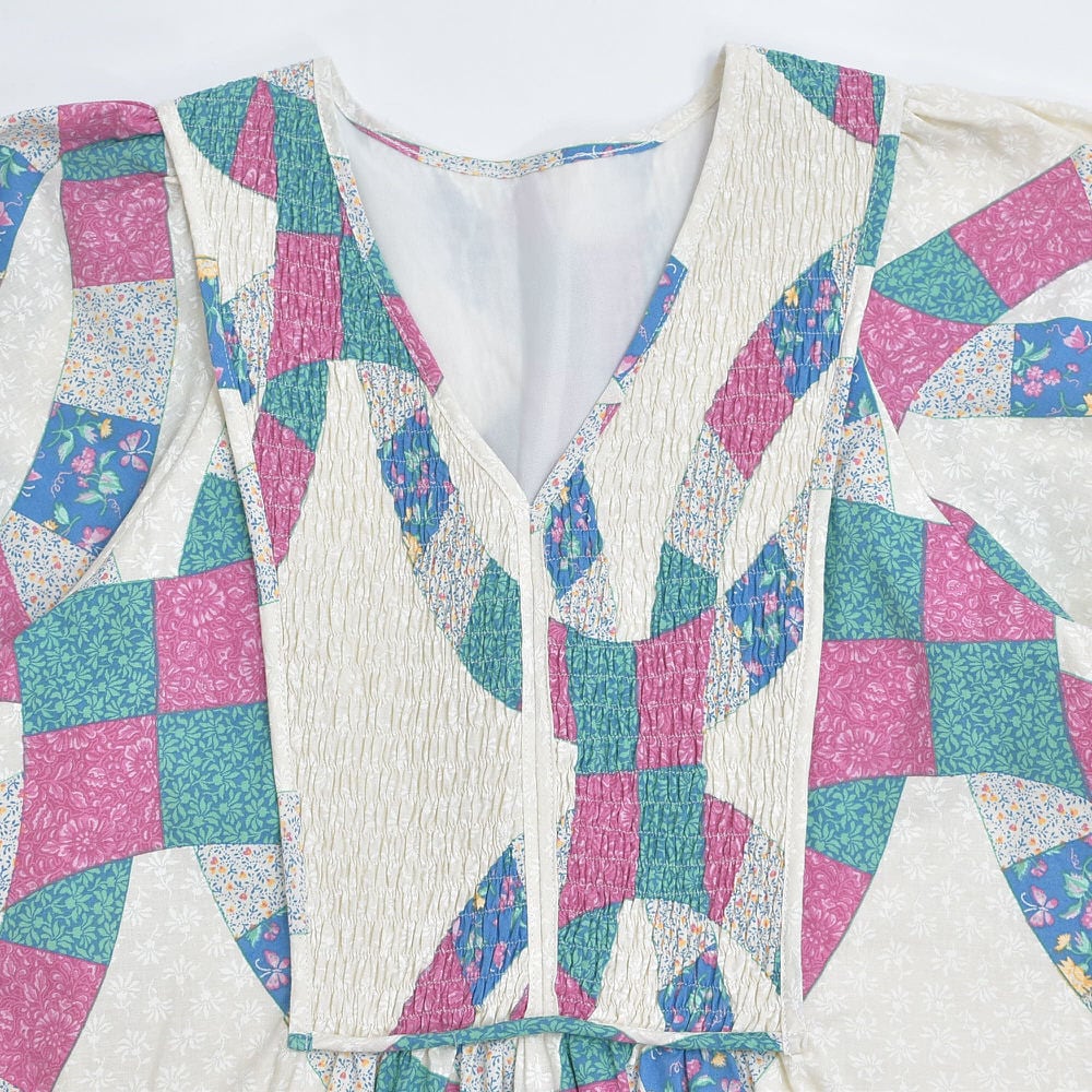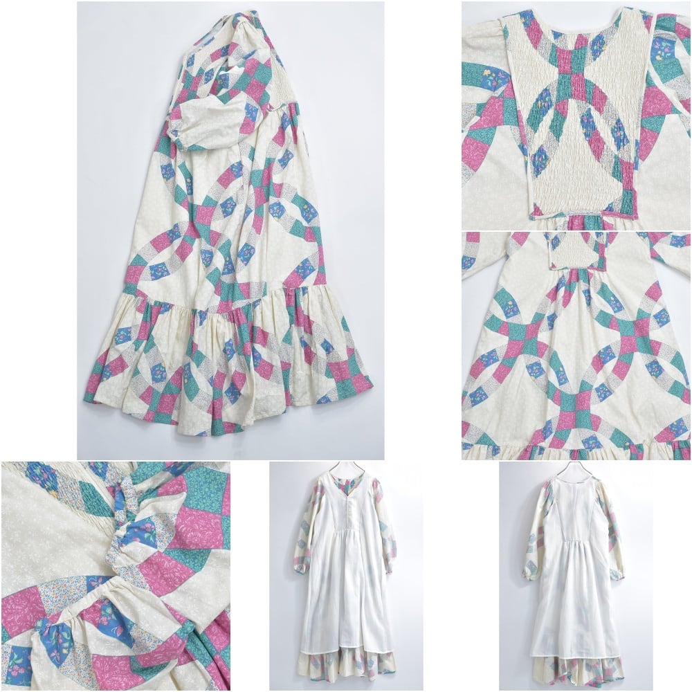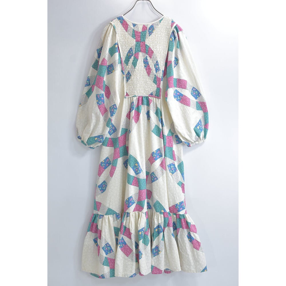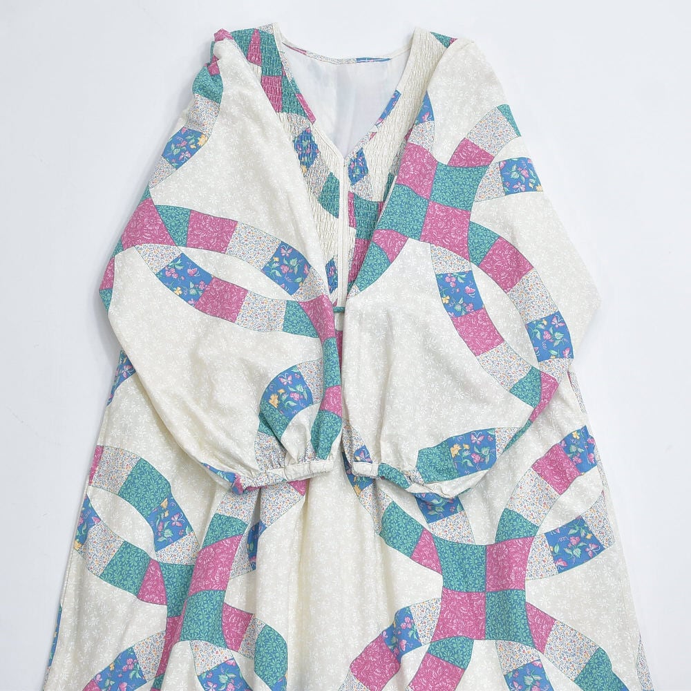 Remake リメイク 再構築 パッチワークキルト風 プリントデザイン ロングワンピース ダブルウエディング 裏地付き レディースM〜相当