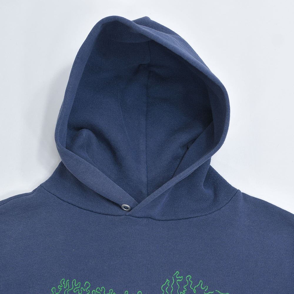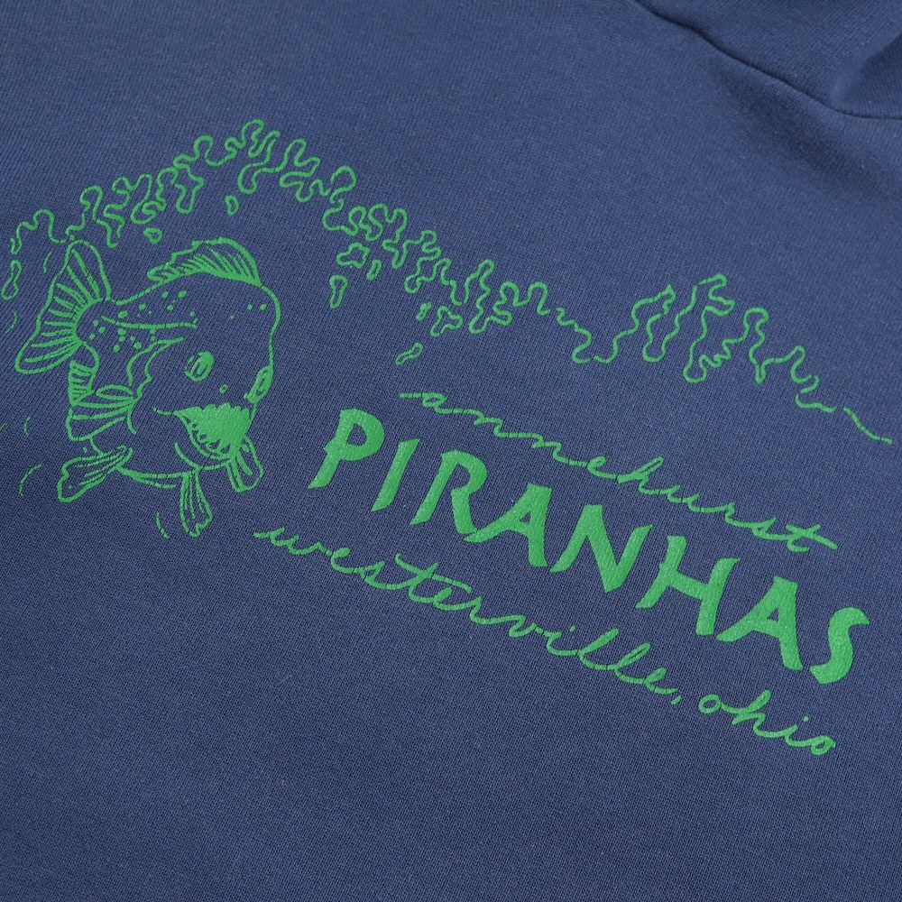 80~90s USA製 JERZEES ジャージーズ ピラニア フロッキープリント 半袖 スウェット パーカー フーディー グッドフェード 紺 ヴィンテージ ビンテージ アメリカ古着 メンズSサイズ