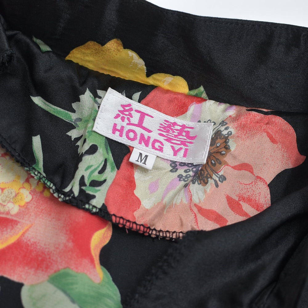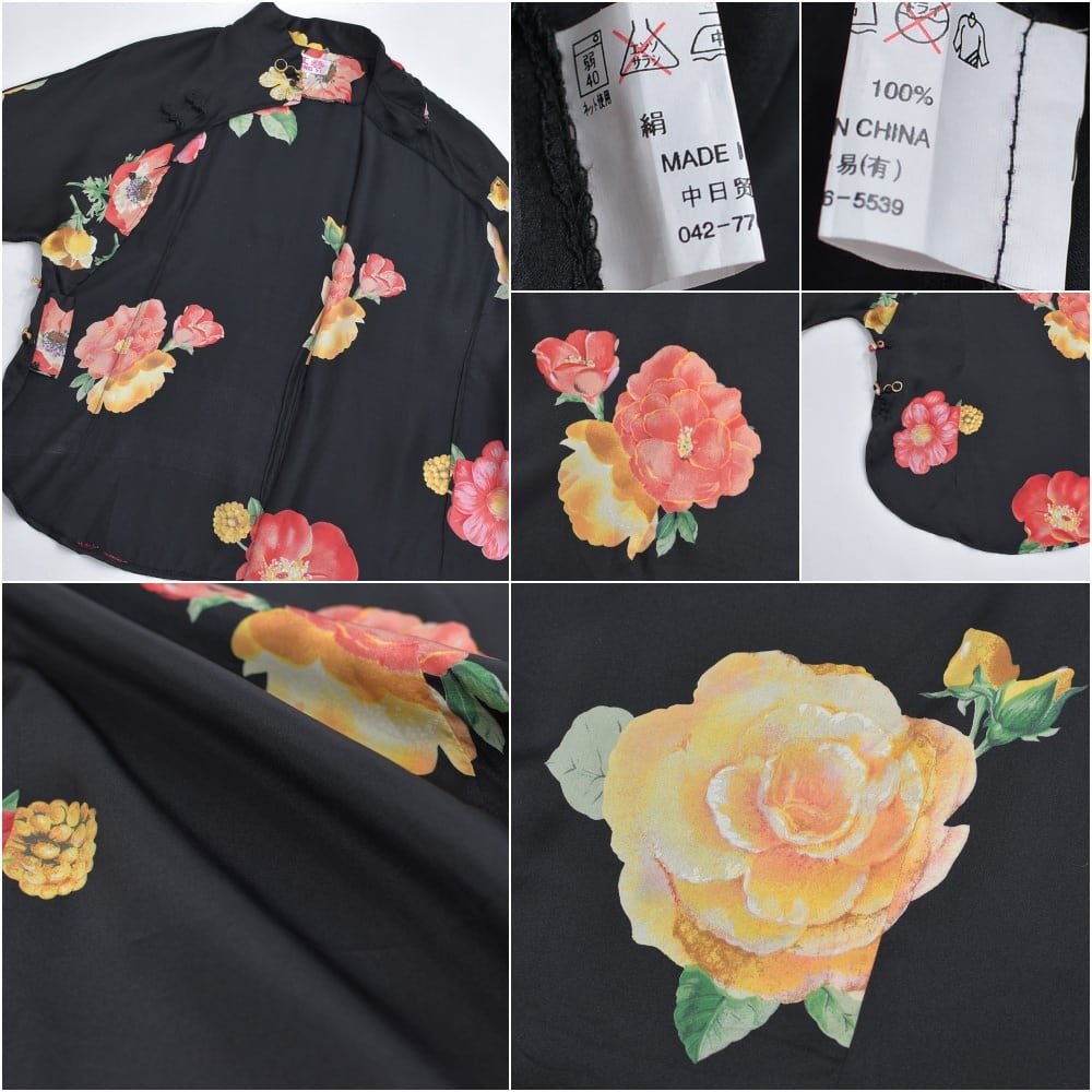 90~00s HONG YI 紅藝 花柄 ドルマンスリーブデザイン シルク マンダリンシャツ チャイナ ブラウス オリエンタル 黒 アジアンヴィンテージ ビンテージ 古着 レディースMサイズ