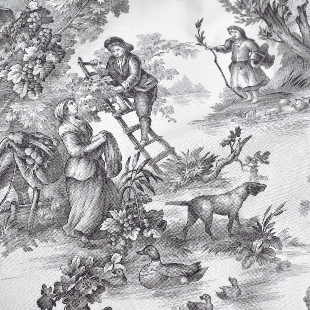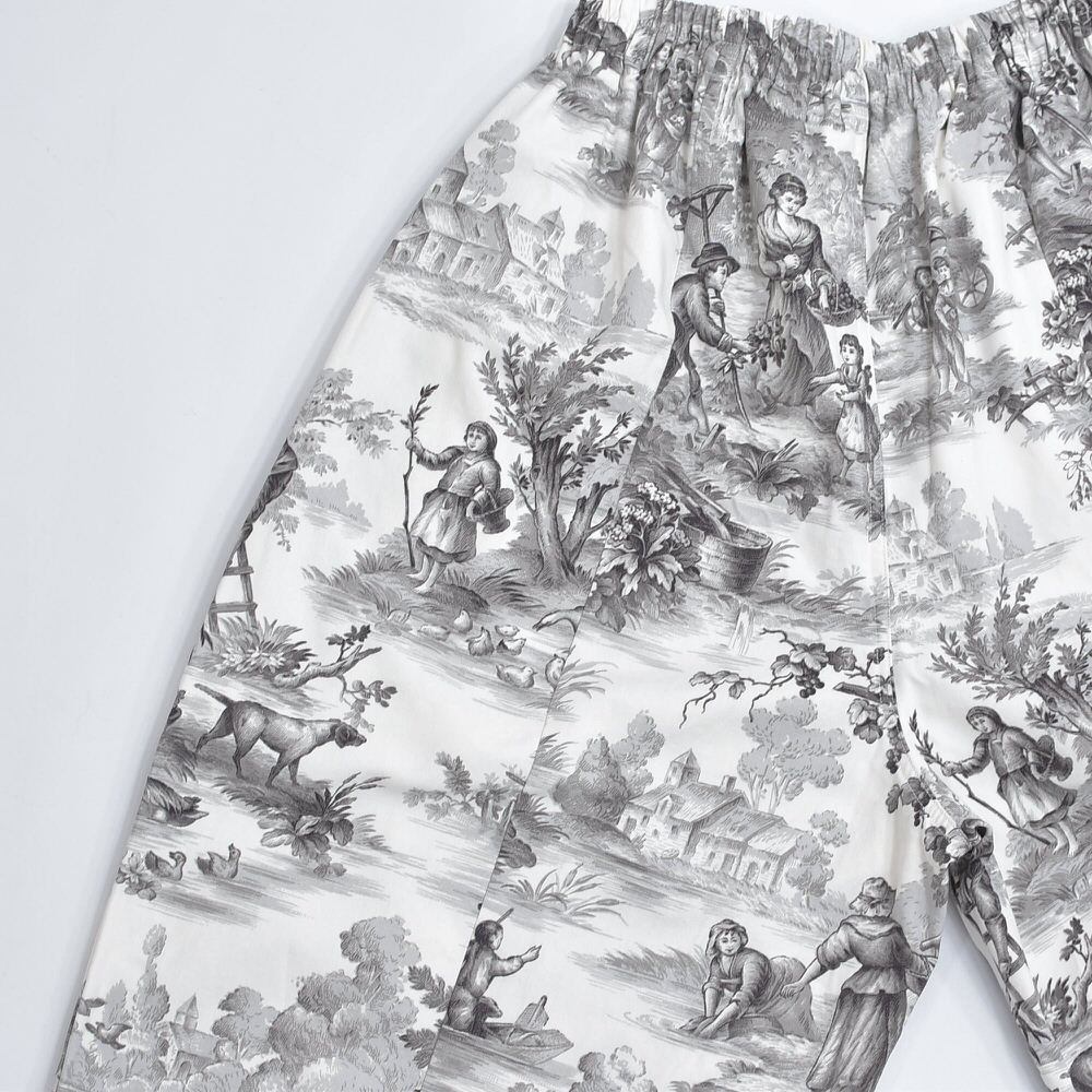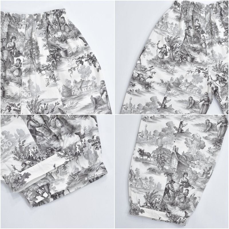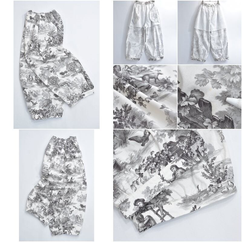 Remake ヴィンテージ アンティーク調 トワル・ド・ジュイ柄 テキスタイル バルーンシルエット イージーパンツ 再構築 ツギハギ ユニセックスサイズ ホワイト 裏地付き W65~108cm