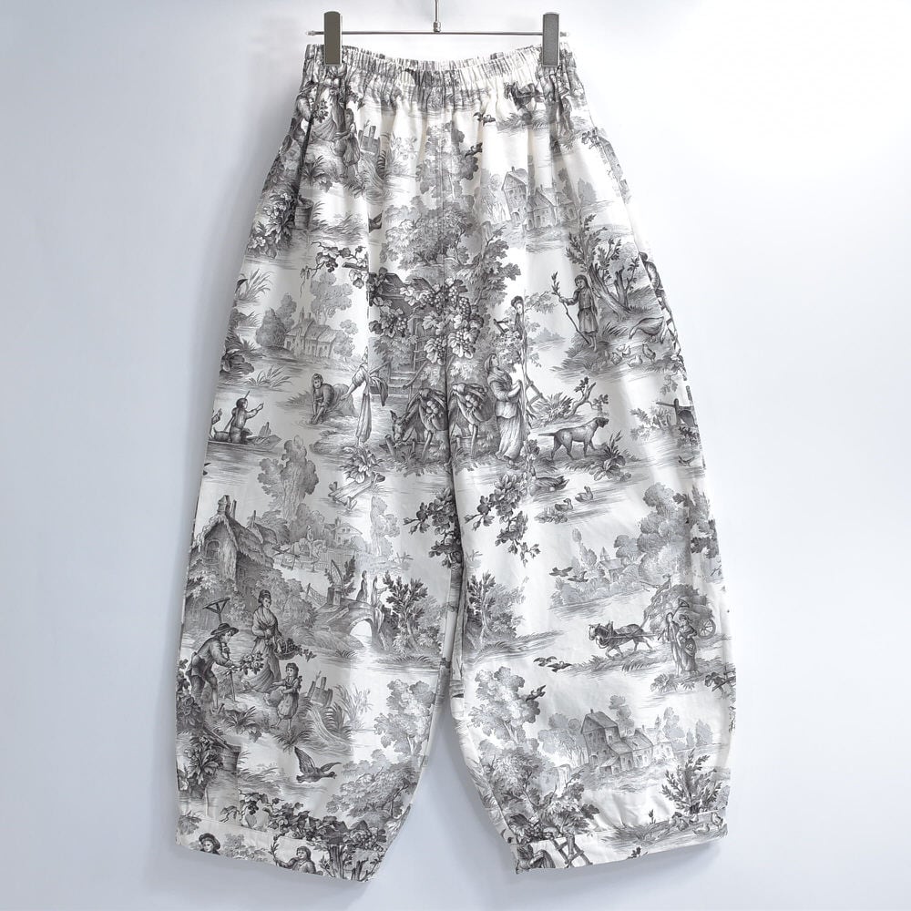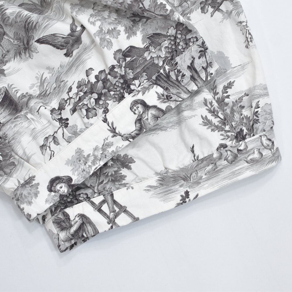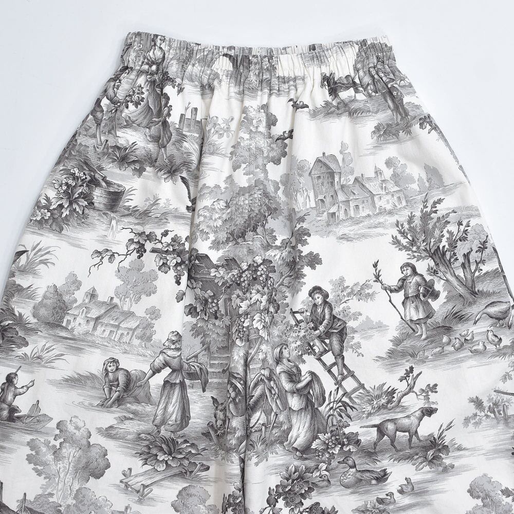 Remake ヴィンテージ アンティーク調 トワル・ド・ジュイ柄 テキスタイル バルーンシルエット イージーパンツ 再構築 ツギハギ ユニセックスサイズ ホワイト 裏地付き W65〜108cm