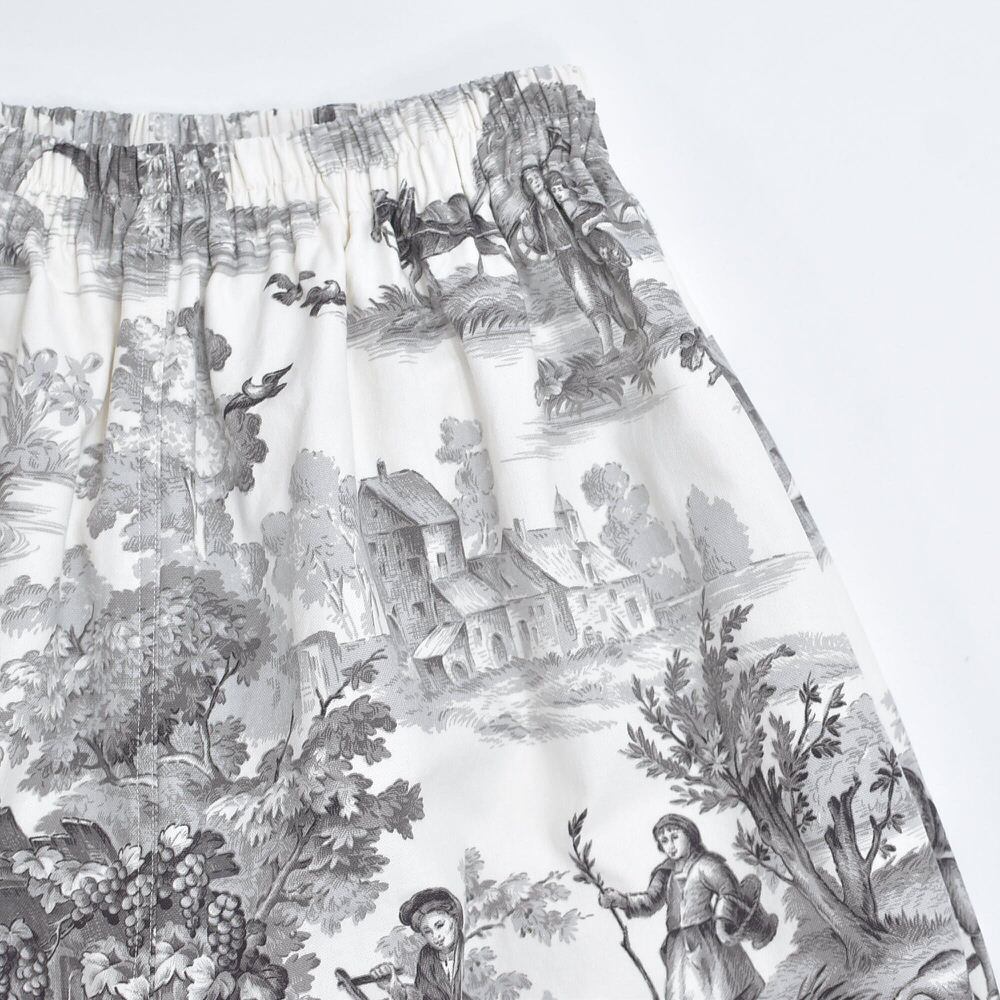 フランスの伝統柄、トワル・ド・ジュイのパターンクロスをボトムスに再構築したリメイクパンツ