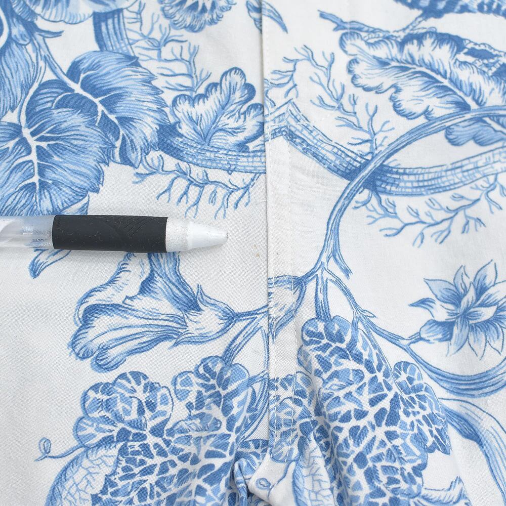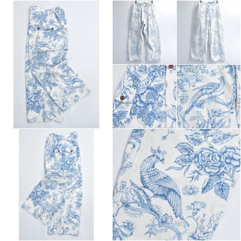 フランスの伝統柄、トワル・ド・ジュイのパターンクロスをボトムスに再構築したリメイクパンツ