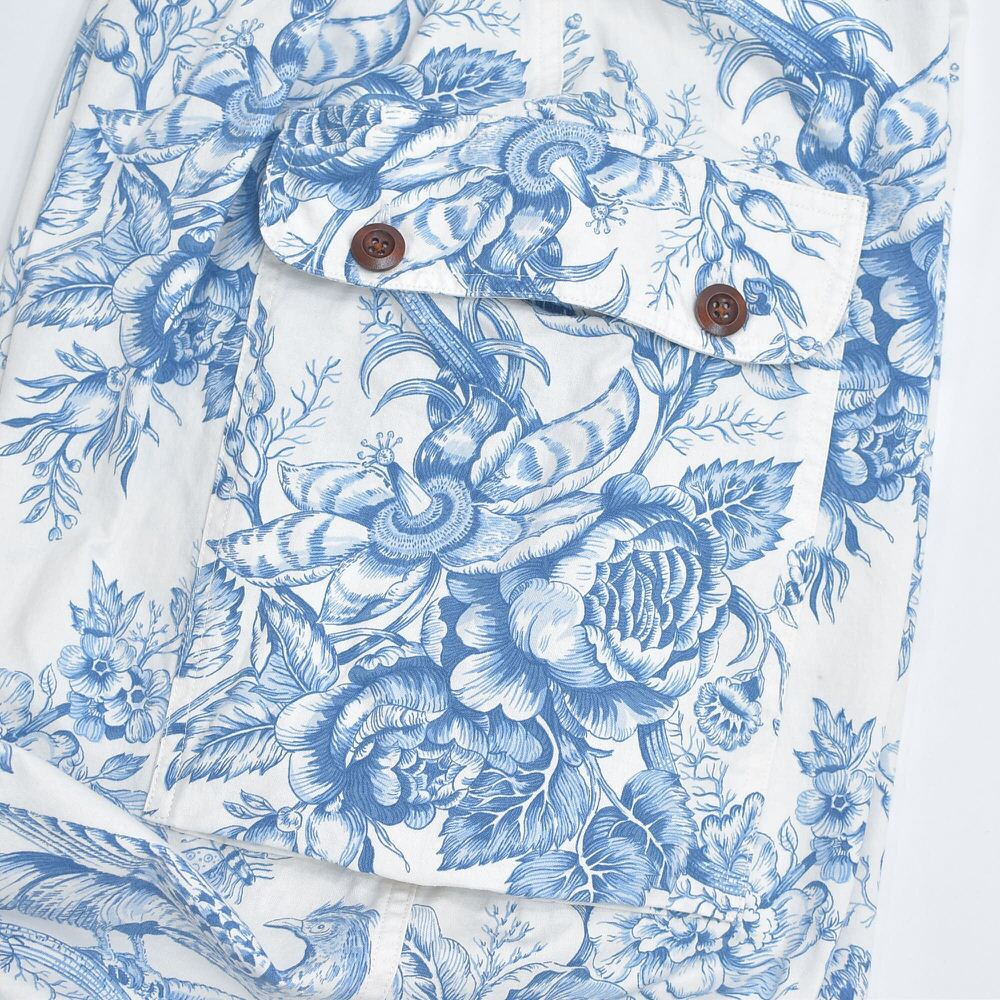 Remake ヴィンテージ アンティーク調 トワル・ド・ジュイ柄 ルーズシルエット カーゴパンツ テキスタイル ボタニカル アニマル 再構築 リメイク 総柄 ホワイト 古着 W68〜84cm