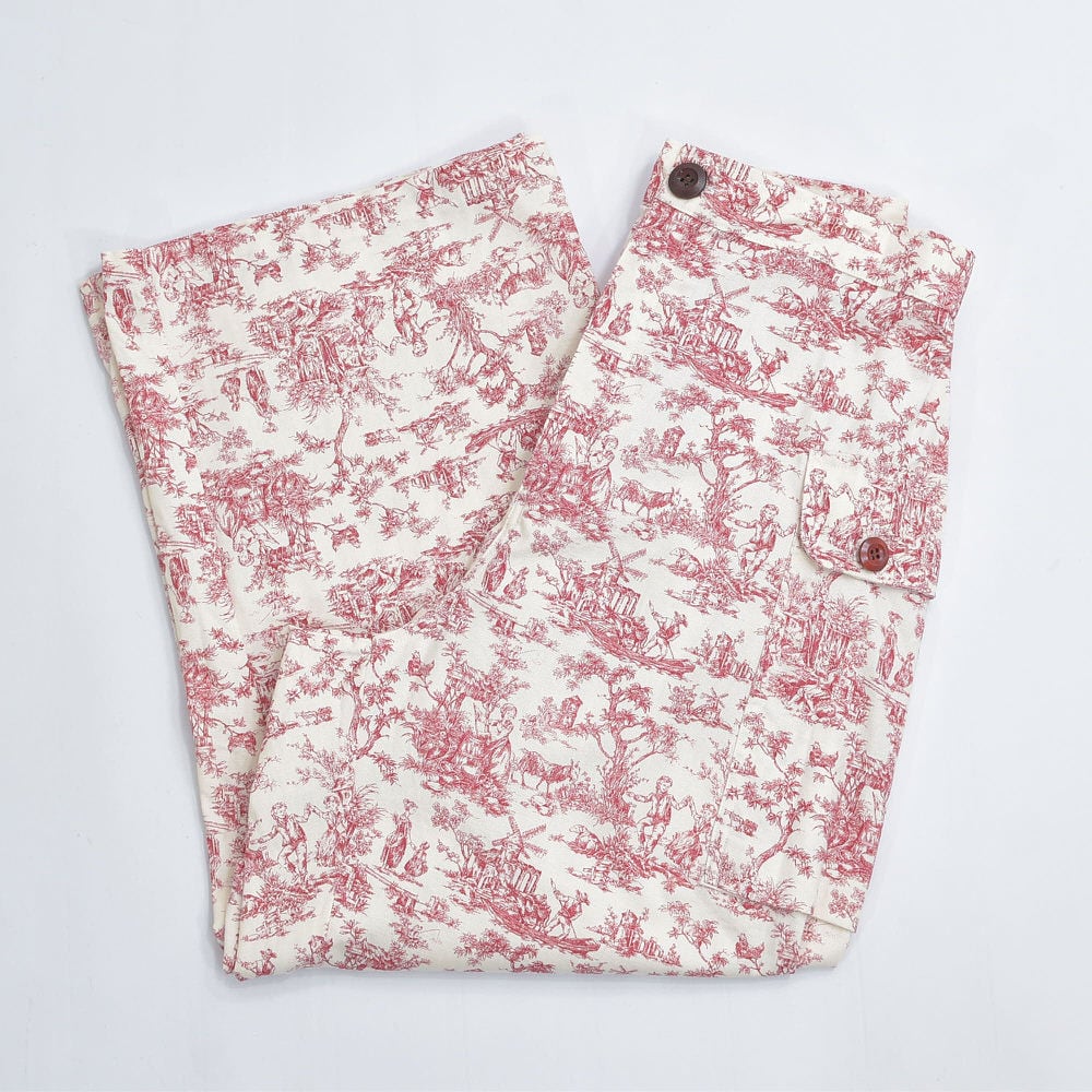 フランスの伝統柄、トワル・ド・ジュイのパターンクロスをボトムスに再構築したリメイクパンツ