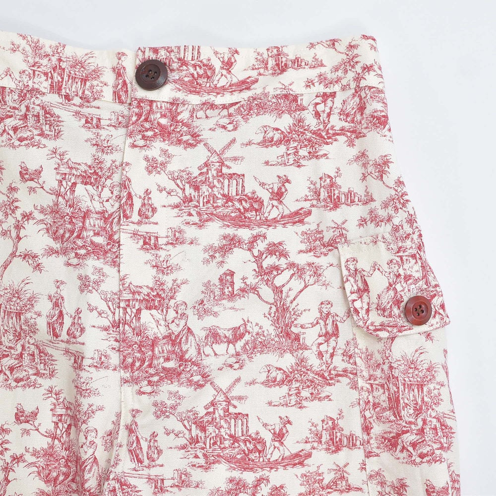 Remake ヴィンテージ アンティーク調 トワル・ド・ジュイ柄 ルーズシルエット カーゴパンツ テキスタイル ボタニカル 風景 再構築 リメイク 総柄 キナリ W69~84cm