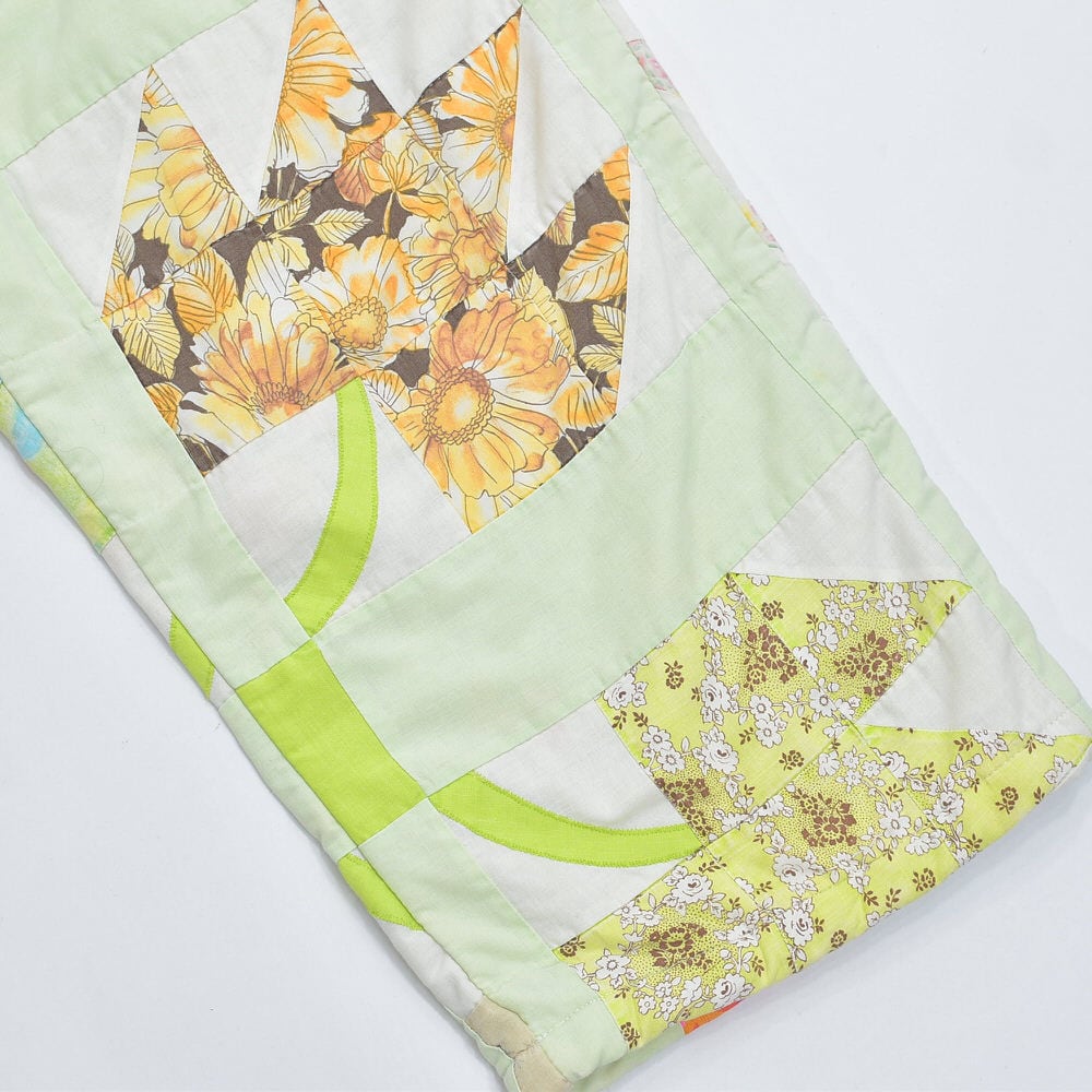 可愛らしいお花のモチーフが描かれたキルト生地をボトムスに再構築したリメイクパンツ